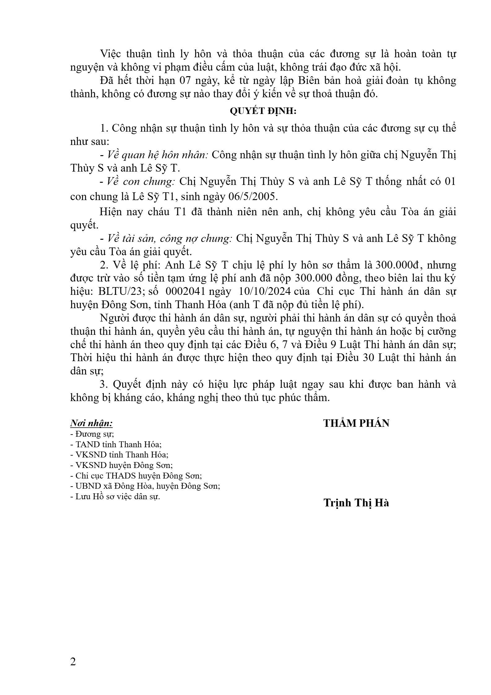 Quyết định số 51/2024/QĐST-HNGĐ ngày 12/11/2024 của TAND huyện Đông Sơn, tỉnh Thanh Hóa về yêu cầu công nhận thuận tình ly hôn