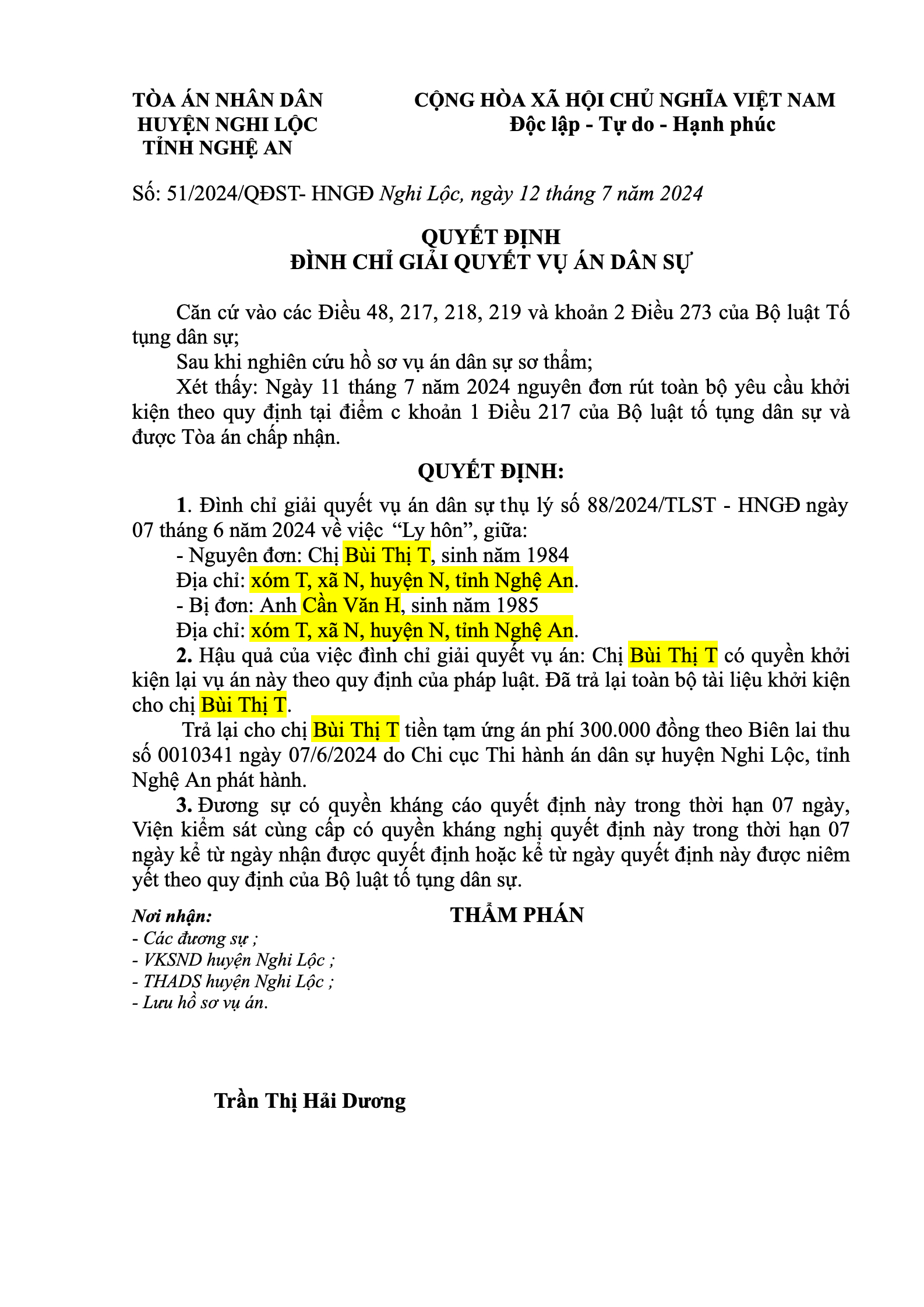 Quyết định số 51/2024/QĐST-HNGĐ ngày 12/07/2024 của TAND huyện Nghi Lộc, tỉnh Nghệ An về vụ án ly hôn về mâu thuẫn gia đình