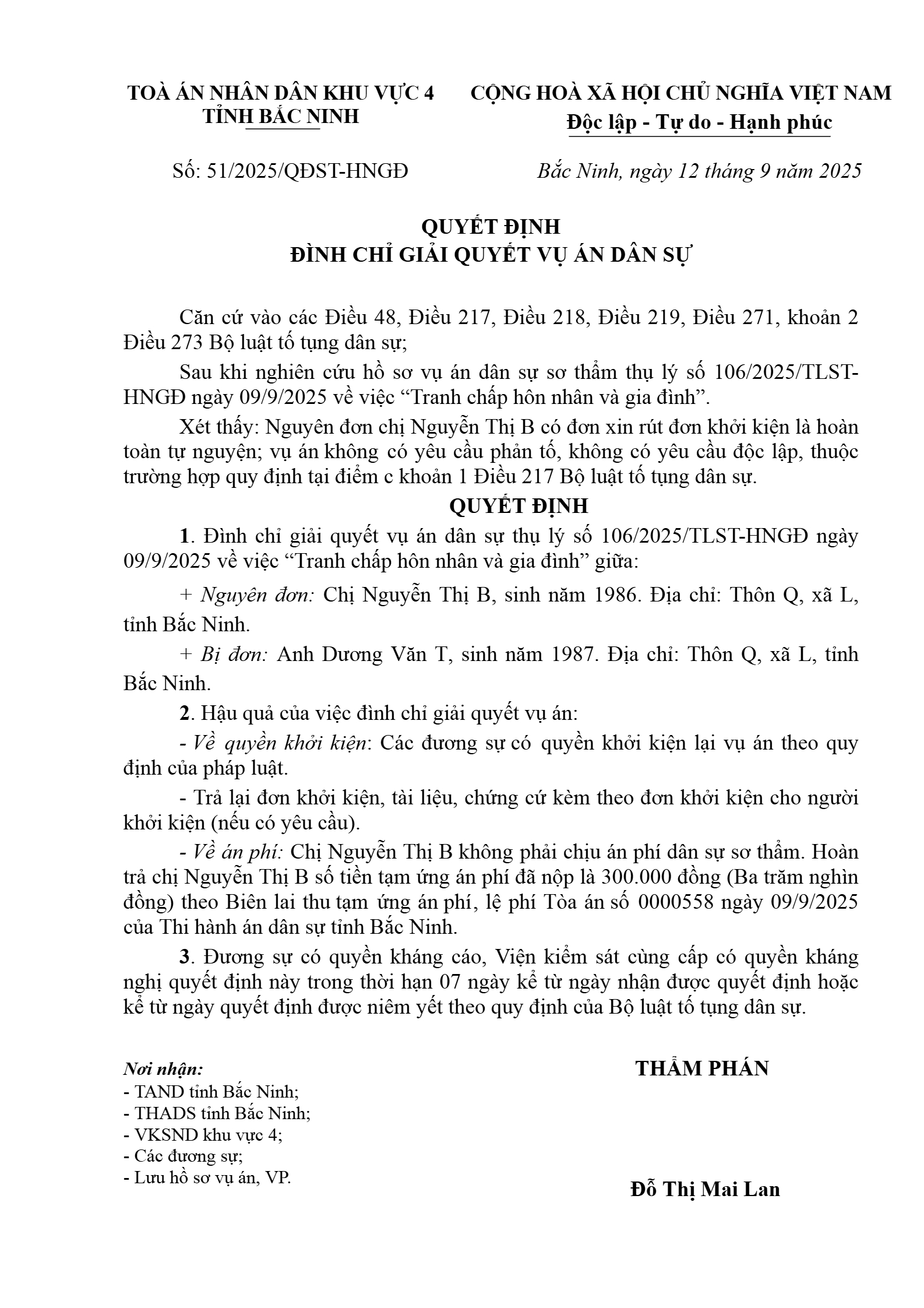 Quyết định số 51/2025/QĐST-HNGĐ ngày 12/09/2025 của Tòa án nhân dân khu vực 4 - Bắc Ninh, tỉnh Bắc Ninh về vụ án ly hôn về mâu thuẫn gia đình