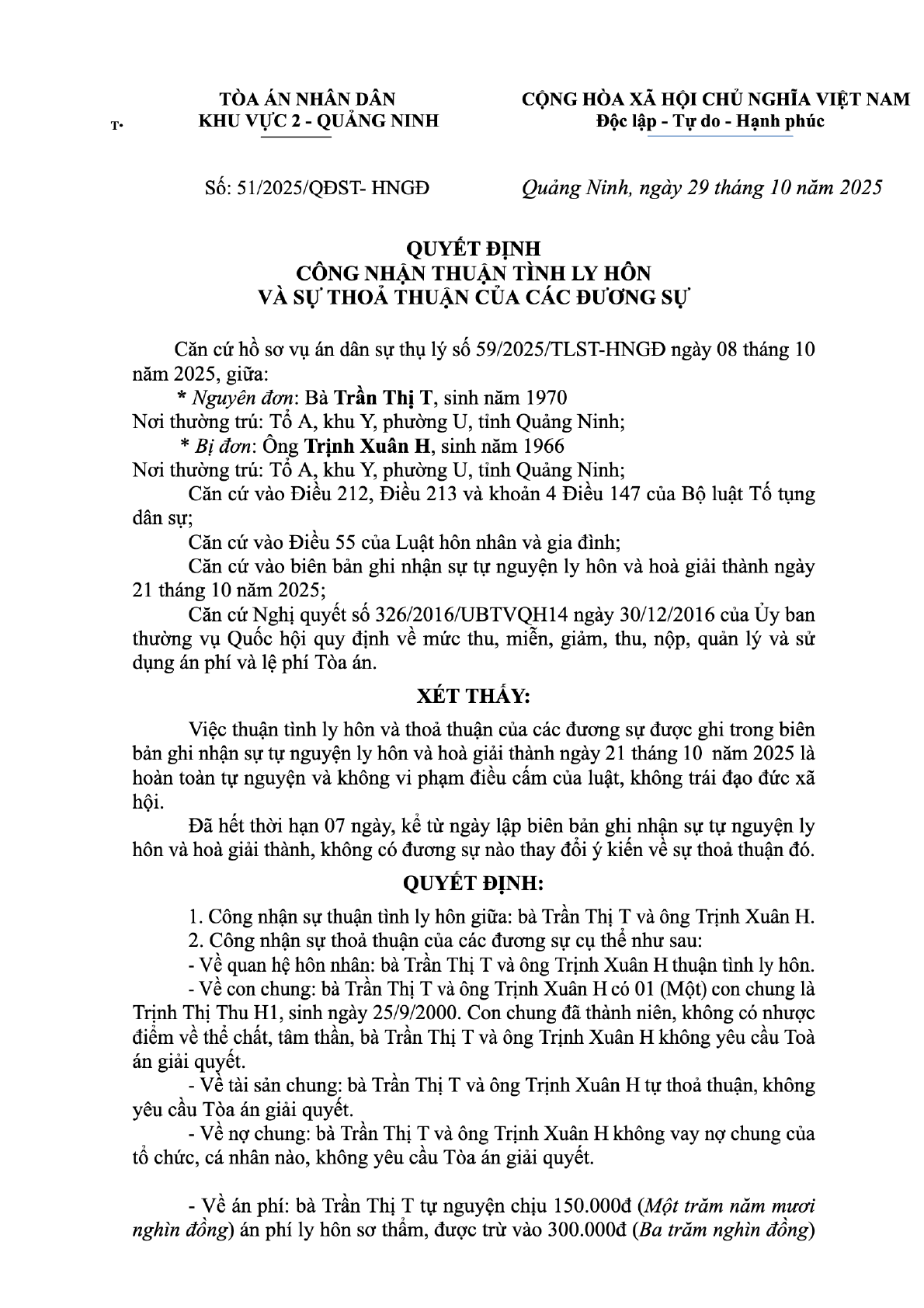Quyết định số 51/2025/QĐST-HNGĐ ngày 29/10/2025 của Tòa án nhân dân khu vực 2 - Quảng Ninh, tỉnh Quảng Ninh về vụ án ly hôn về mâu thuẫn gia đình