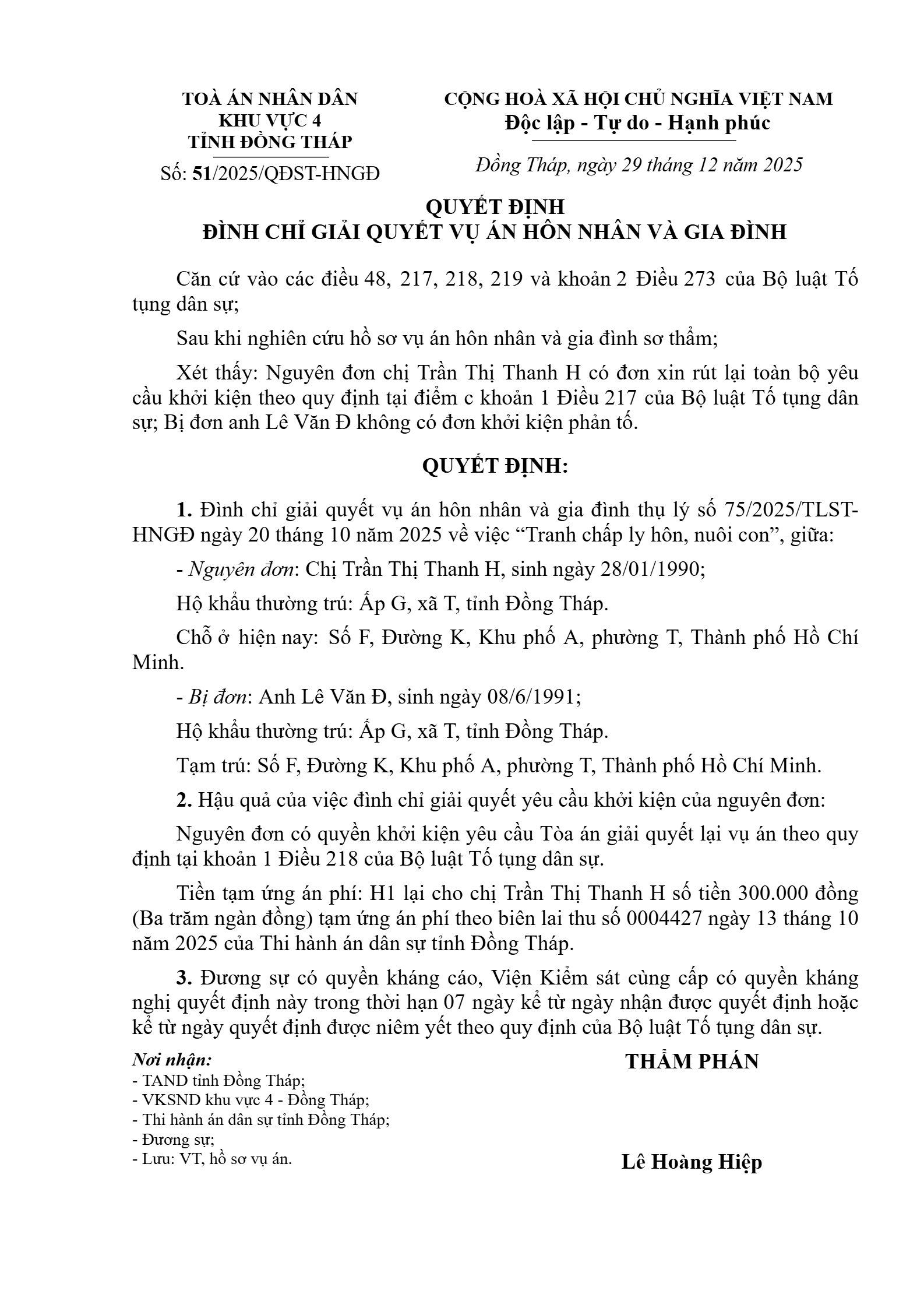 Quyết định số 51/2025/QĐST-HNGĐ ngày 29/12/2025 của Tòa án nhân dân khu vực 4 - Đồng Tháp, tỉnh Đồng Tháp về vụ án ly hôn về mâu thuẫn gia đình
