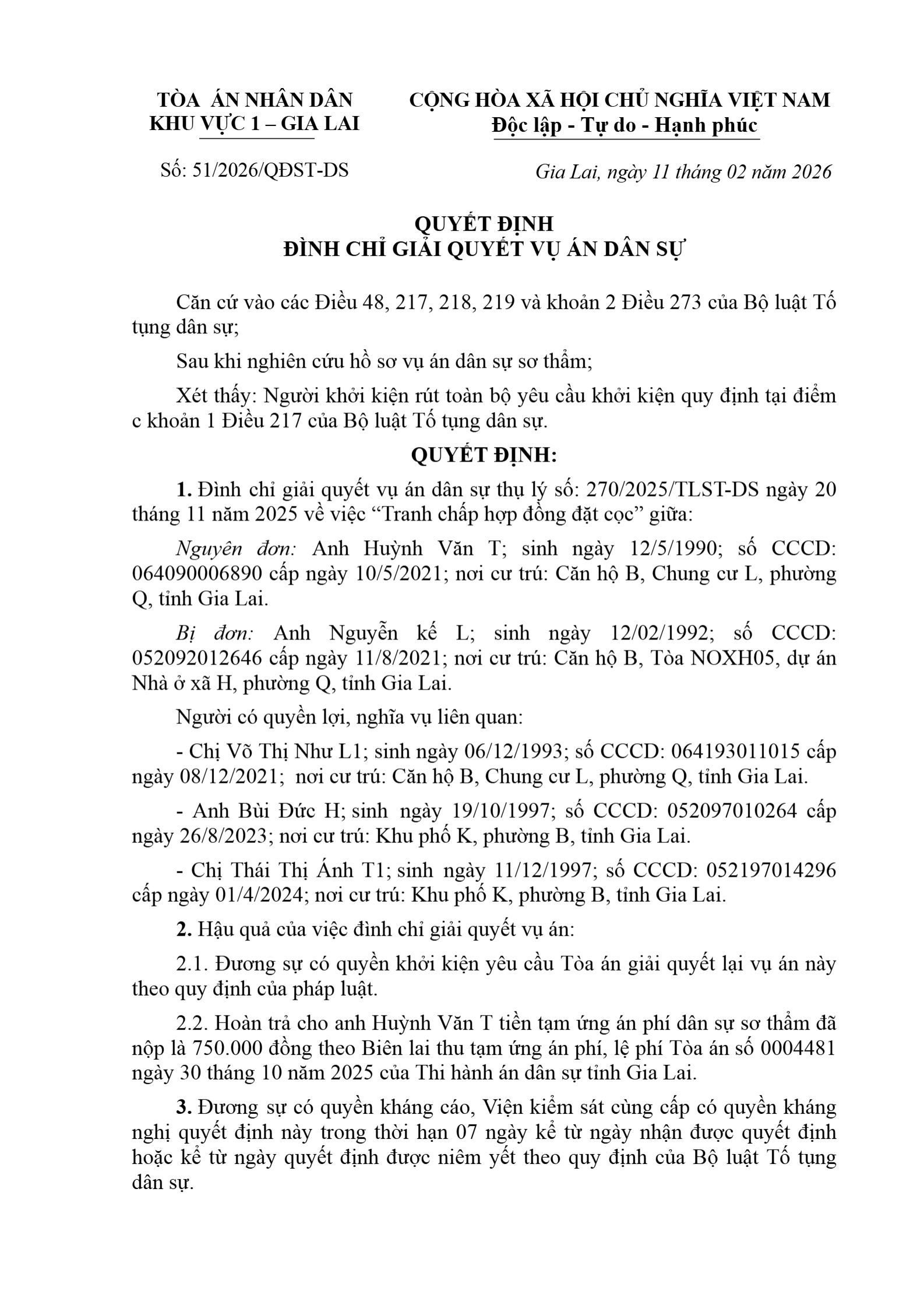 Quyết định số 51/2026/QĐST-DS ngày 11/02/2026 của Tòa án nhân dân khu vực 1 - Gia Lai, tỉnh Gia Lai về tranh chấp hợp đồng đặt cọc