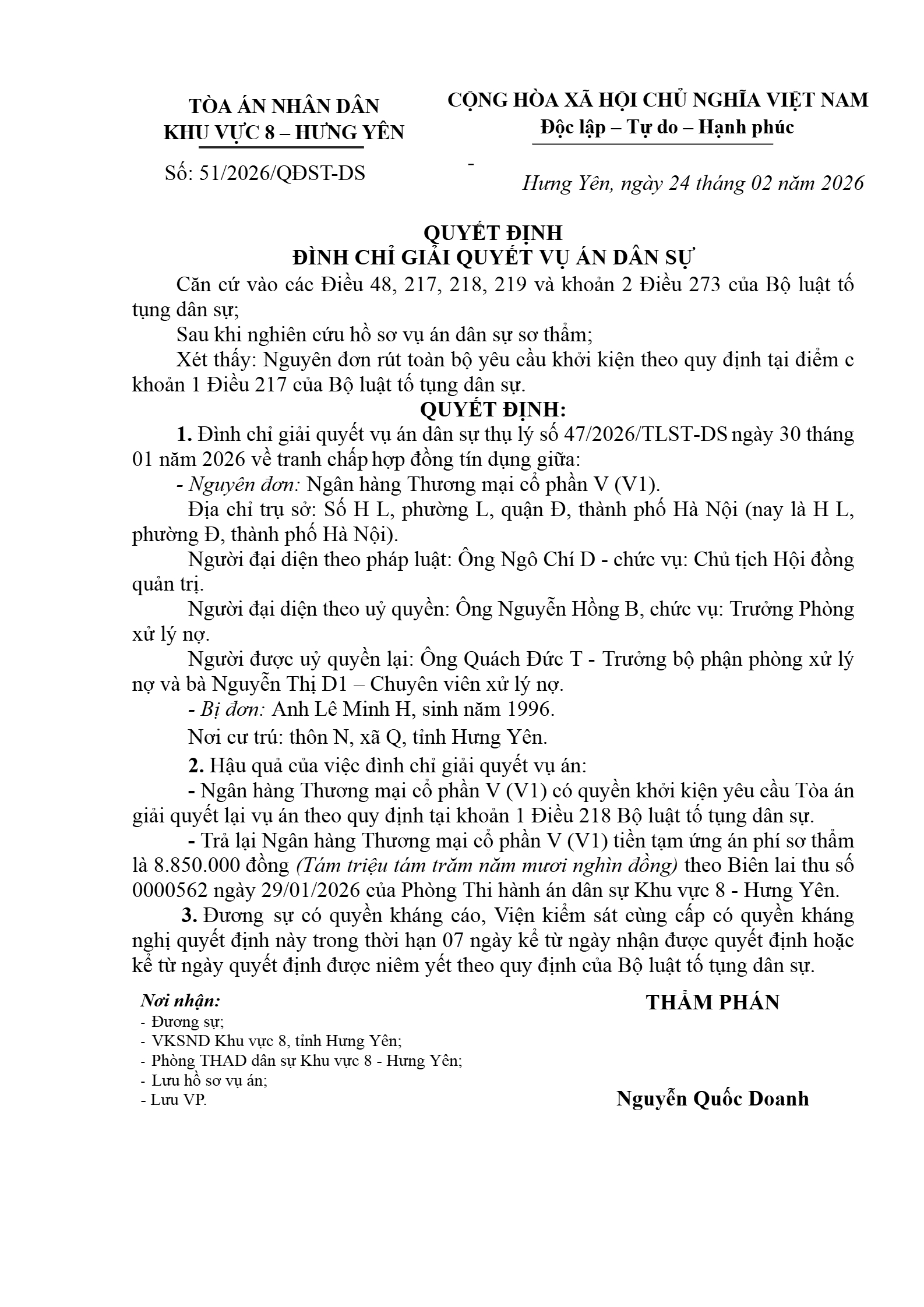 Quyết định số 51/2026/QĐST-DS ngày 24/02/2026 của Tòa án nhân dân khu vực 8 - Hưng Yên, tỉnh Hưng Yên về tranh chấp hợp đồng tín dụng