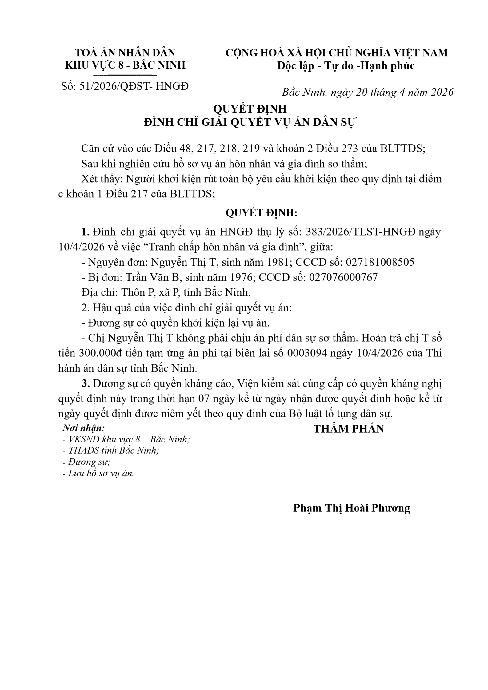 Quyết định số 51/2026/QĐST-HNGĐ ngày 20/04/2026 của Tòa án nhân dân khu vực 8 - Bắc Ninh, tỉnh Bắc Ninh về vụ án ly hôn về mâu thuẫn gia đình