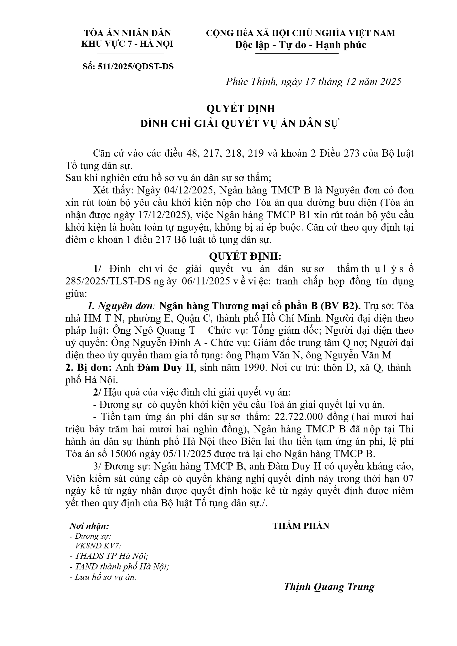 Quyết định số 511/2025/QĐST-DS ngày 17/12/2025 của Tòa án nhân dân khu vực 7 - Hà Nội, TP. Hà Nội về tranh chấp hợp đồng tín dụng