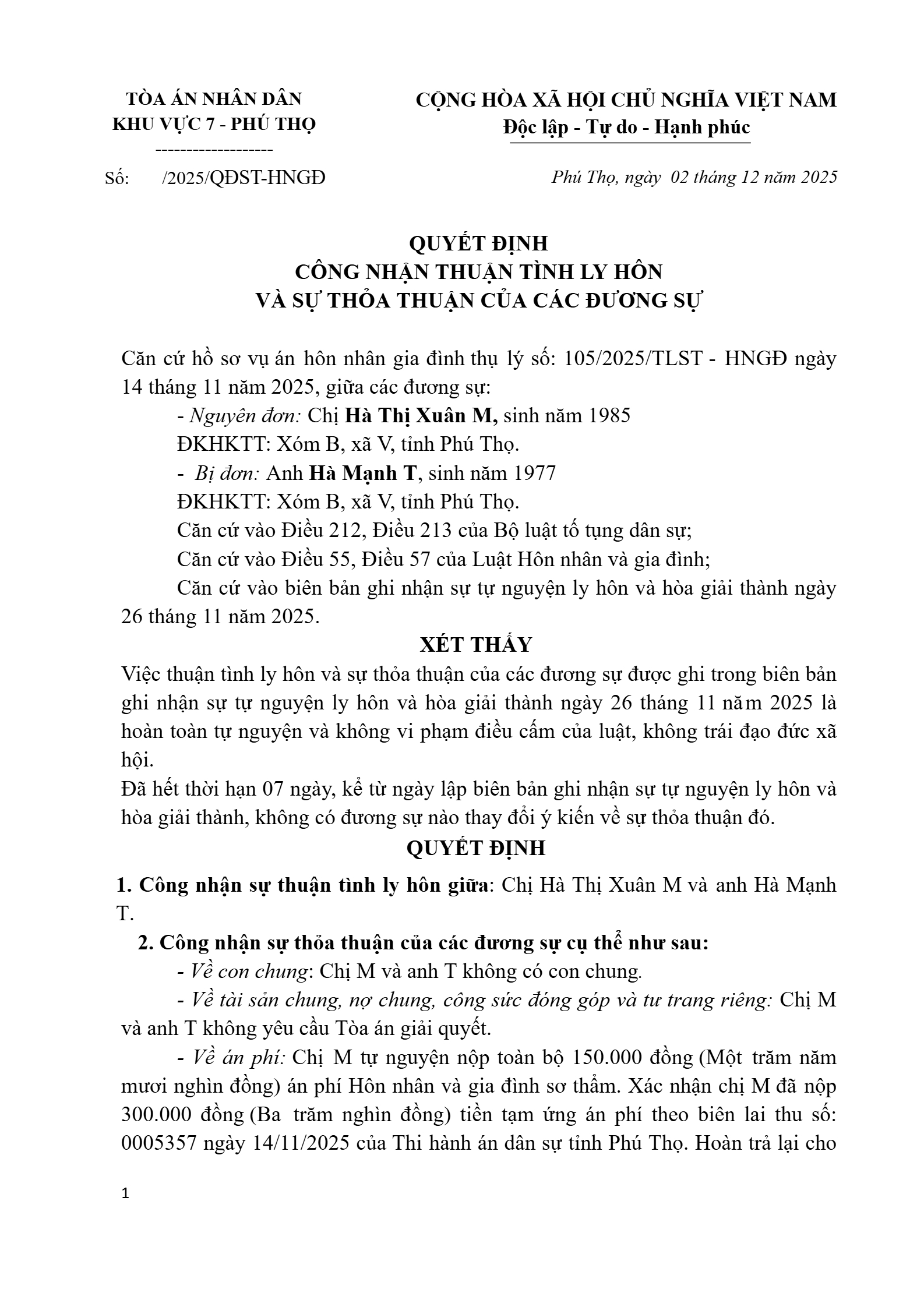 Quyết định số 52/2025/QĐST-HNGĐ ngày 02/12/2025 của Tòa án nhân dân khu vực 7 - Phú Thọ, tỉnh Phú Thọ về vụ án ly hôn về mâu thuẫn gia đình
