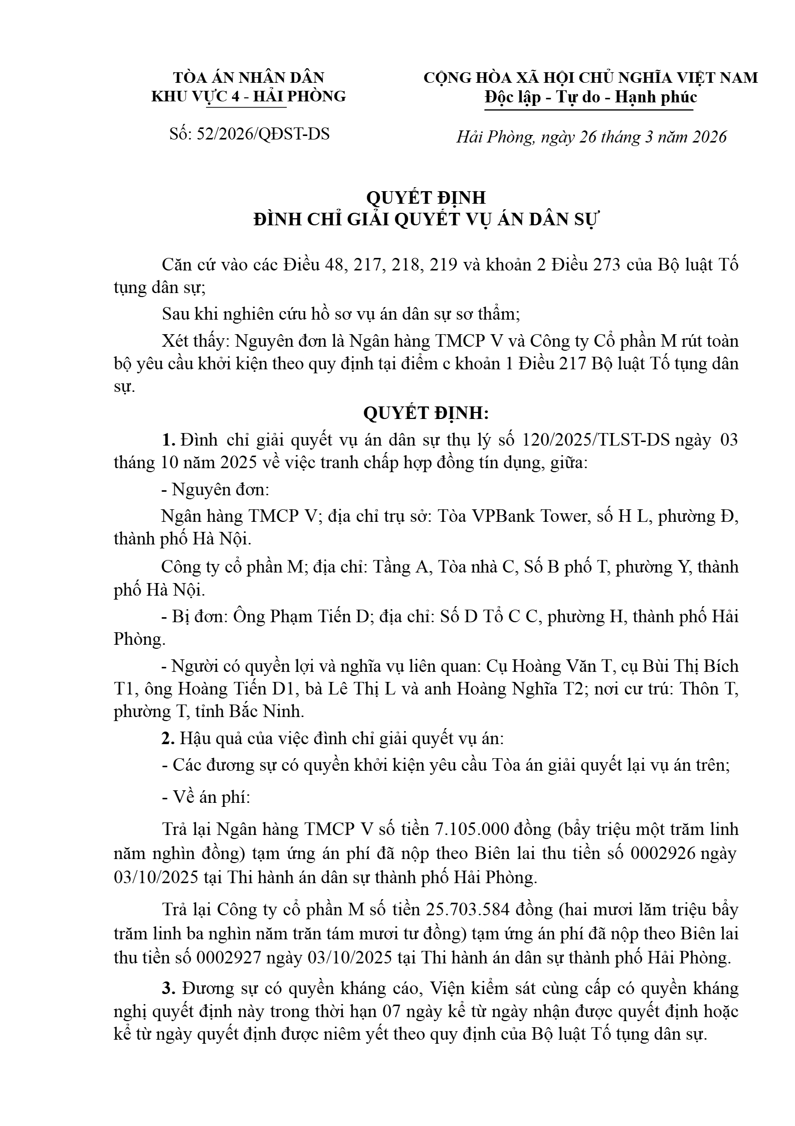 Quyết định số 52/2026/QĐST-DS ngày 26/03/2026 của Tòa án nhân dân khu vực 4 - Hải Phòng, TP. Hải Phòng về tranh chấp hợp đồng tín dụng