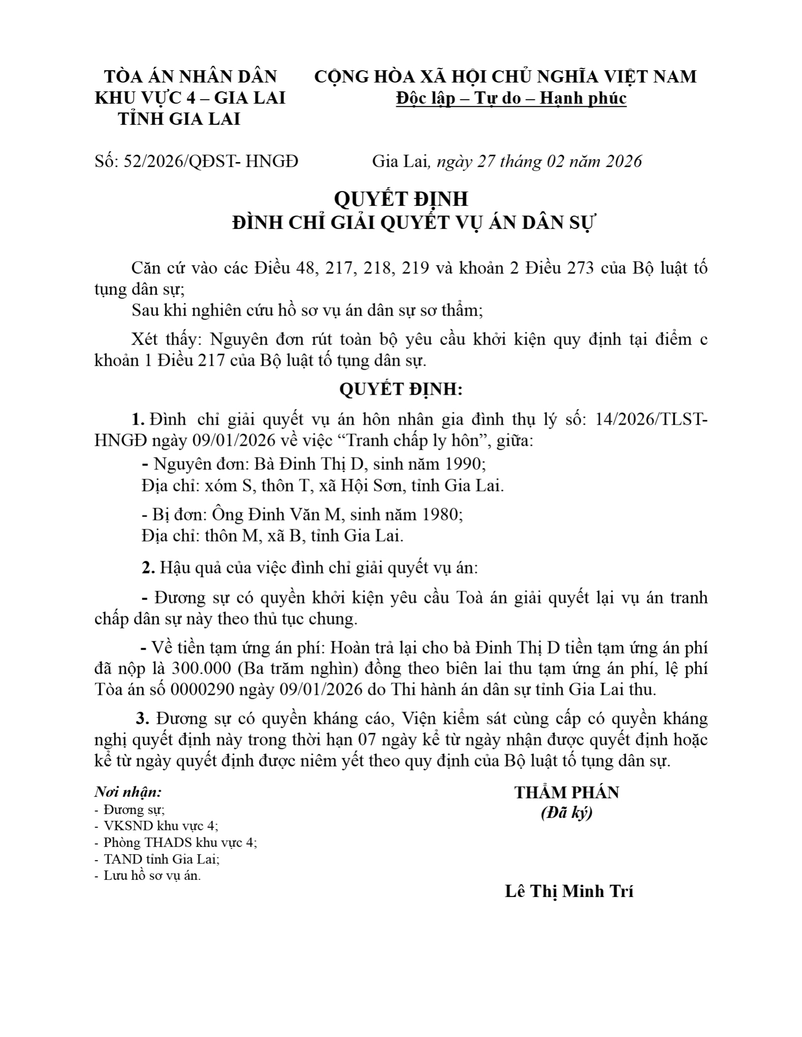 Quyết định số 52/2026/QĐST-HNGĐ ngày 27/02/2026 của Tòa án nhân dân khu vực 4 - Gia Lai, tỉnh Gia Lai về vụ án ly hôn về mâu thuẫn gia đình