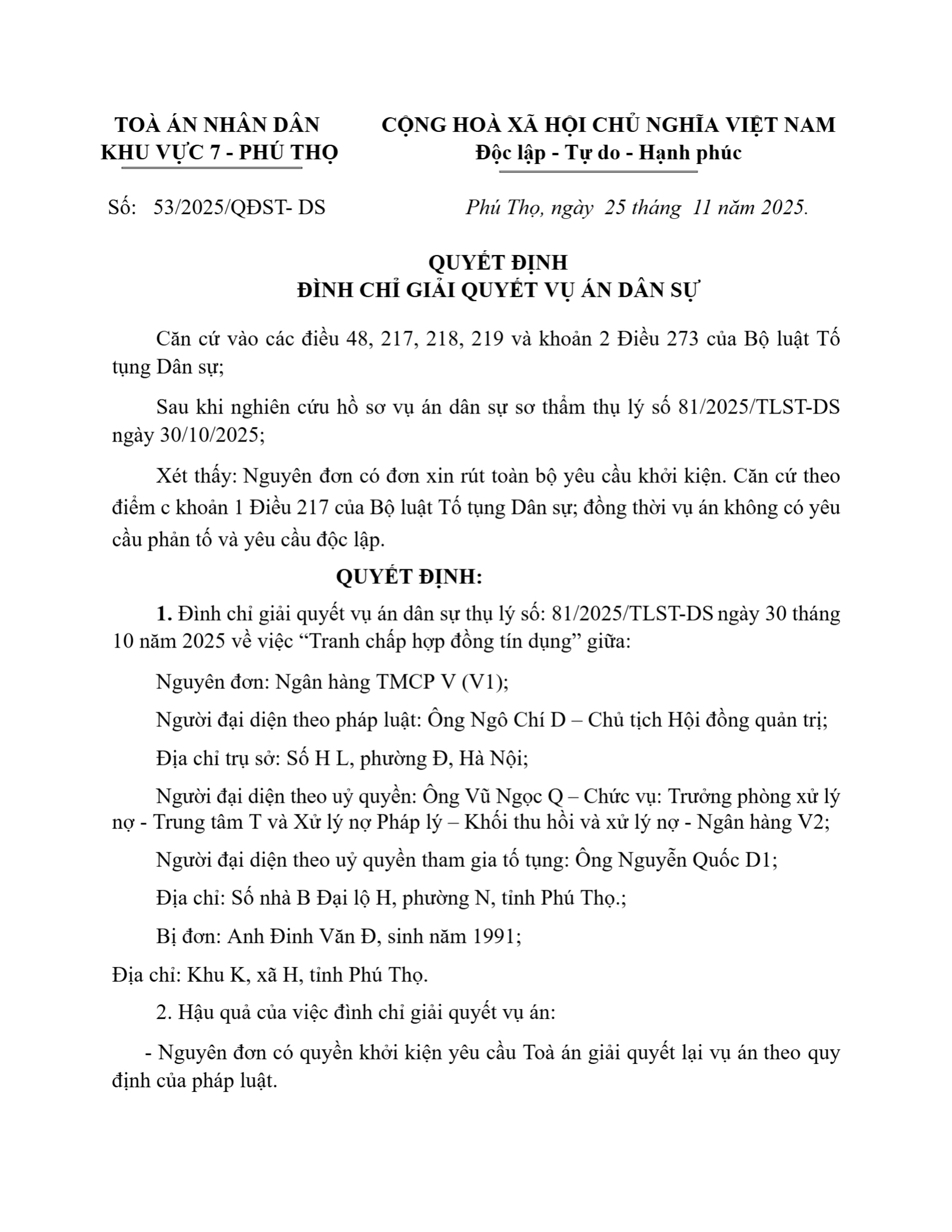 Quyết định số 53/2025/QĐST-DS ngày 25/11/2025 của Tòa án nhân dân khu vực 7 - Phú Thọ, tỉnh Phú Thọ về tranh chấp hợp đồng tín dụng