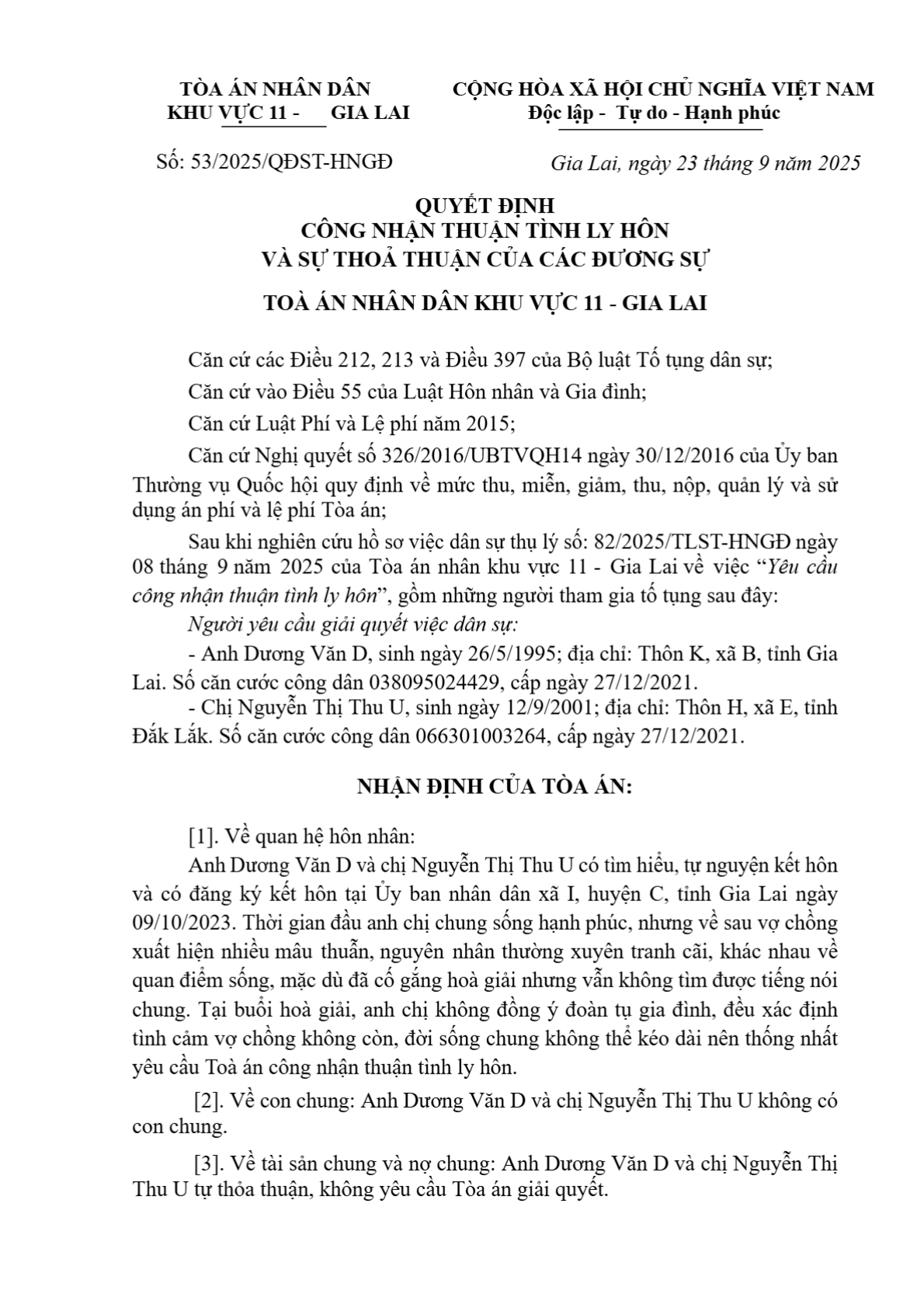 Quyết định số 53/2025/QĐST-HNGĐ ngày 23/09/2025 của Tòa án nhân dân khu vực 11 - Gia Lai, tỉnh Gia Lai về vụ án ly hôn về mâu thuẫn gia đình