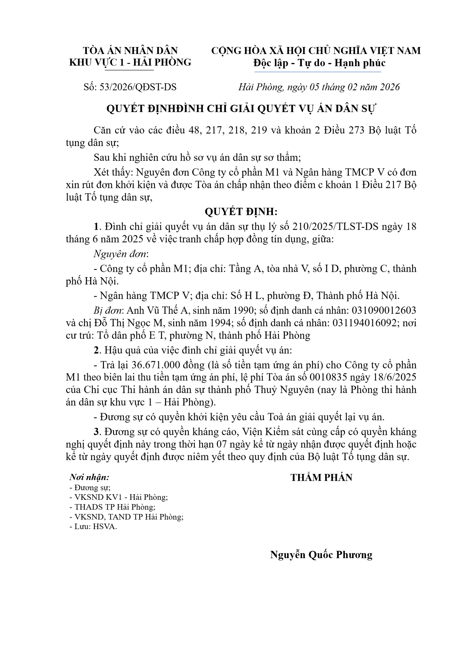 Quyết định số 53/2026/QĐST-DS ngày 05/02/2026 của Tòa án nhân dân khu vực 1 - Hải Phòng, TP. Hải Phòng về tranh chấp hợp đồng tín dụng