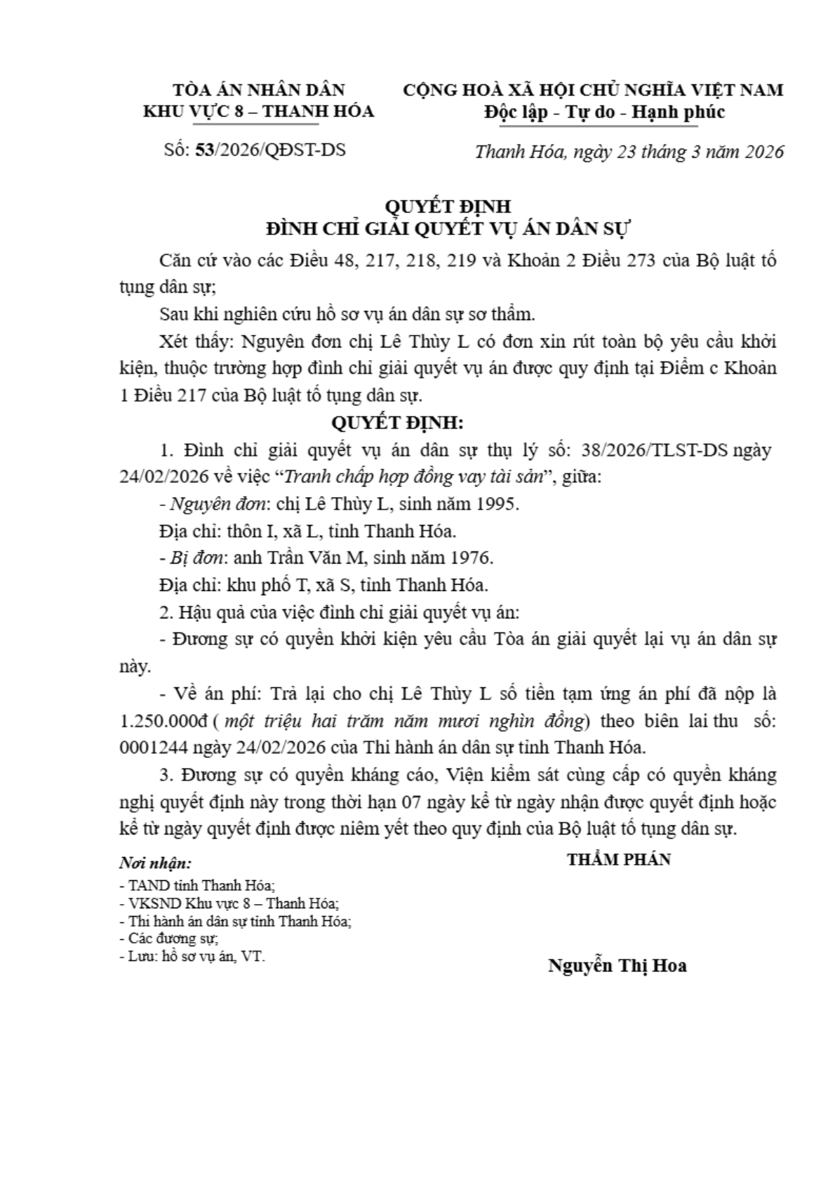 Quyết định số 53/2026/QĐST-DS ngày 23/03/2026 của Tòa án nhân dân khu vực 8 - Thanh Hóa, tỉnh Thanh Hóa về tranh chấp hợp đồng vay tài sản