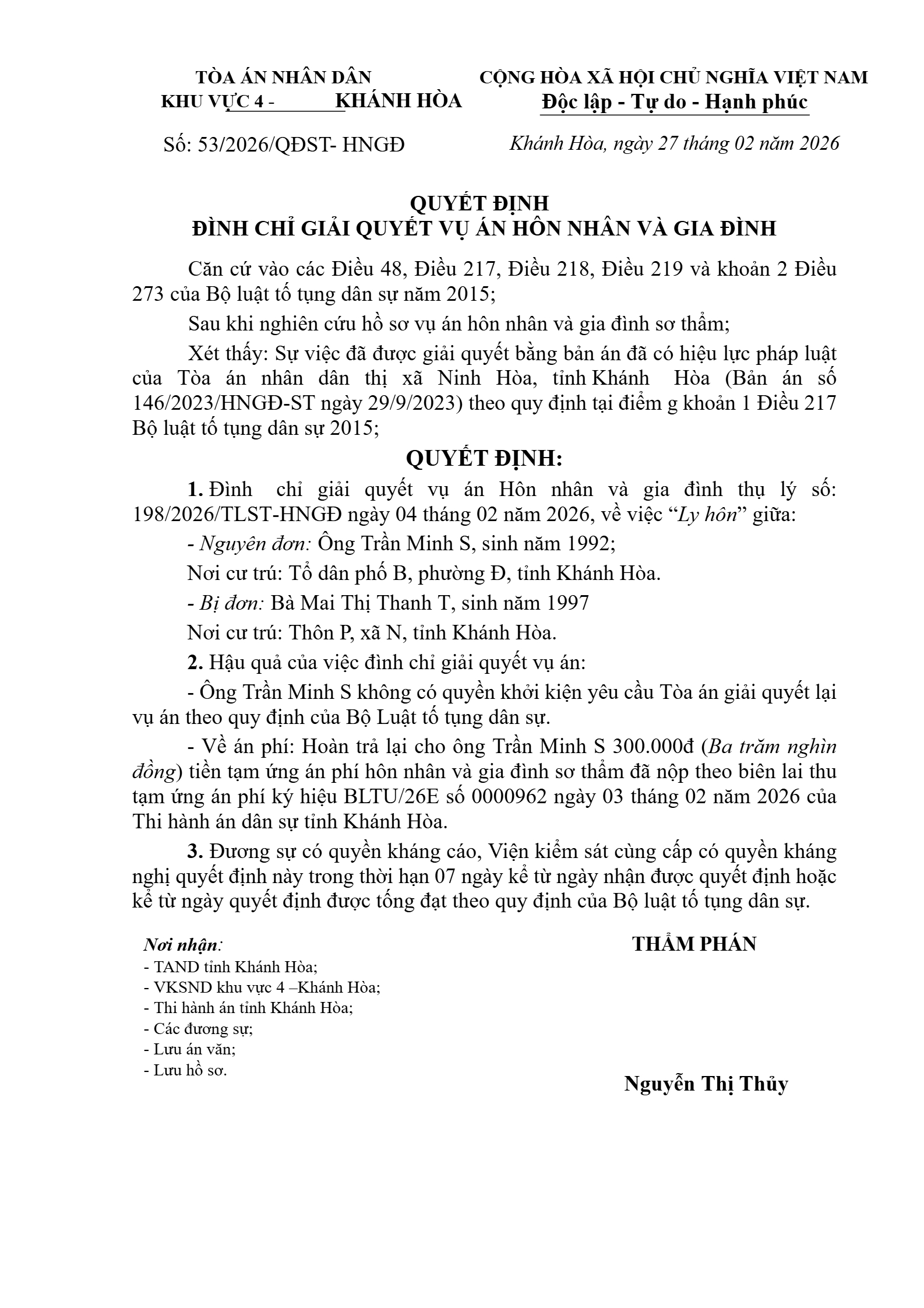 Quyết định số 53/2026/QĐST-HNGĐ ngày 27/02/2026 của Tòa án nhân dân khu vực 4 - Khánh Hòa, tỉnh Khánh Hòa về vụ án ly hôn về mâu thuẫn gia đình
