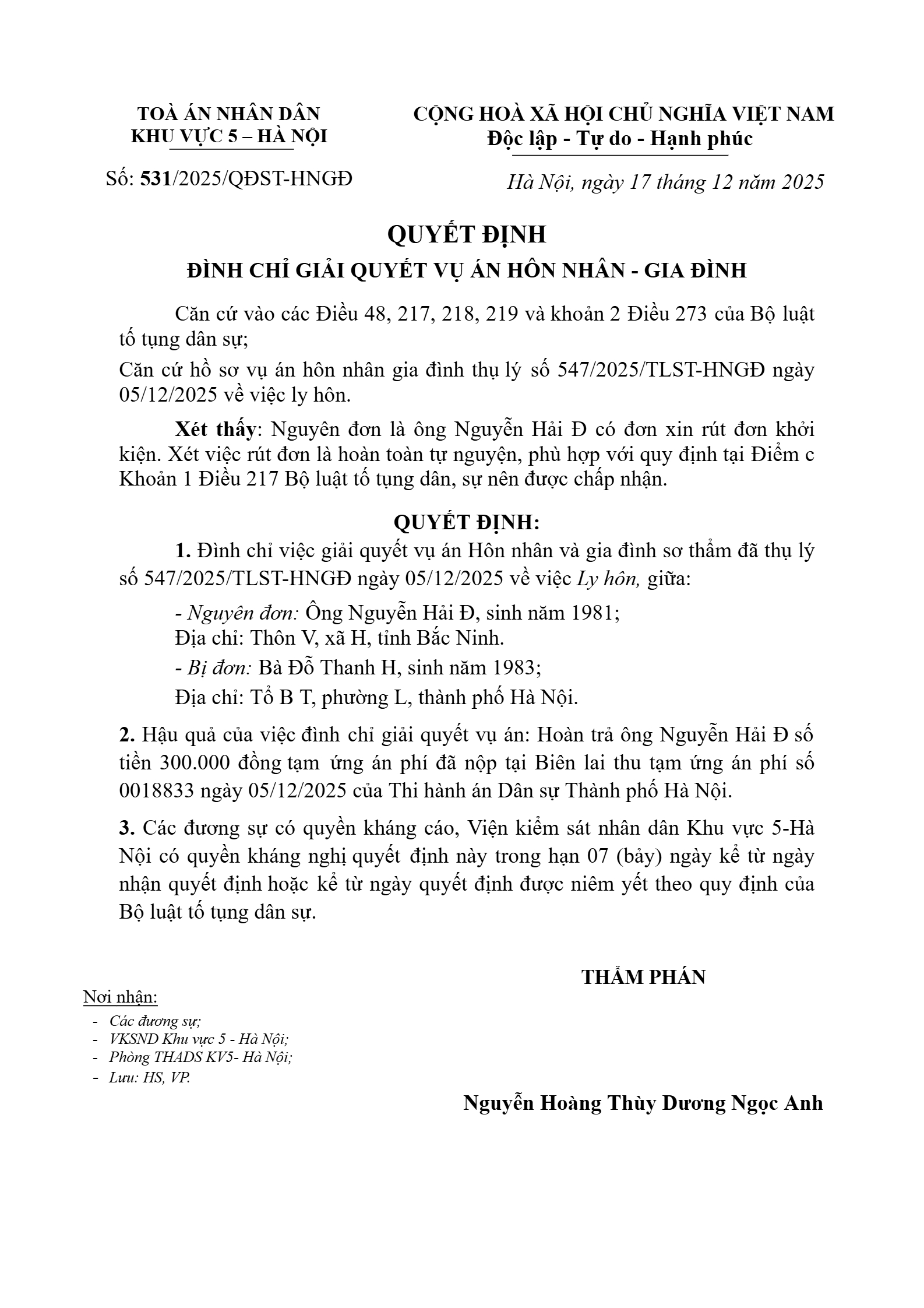 Quyết định số 531/2025/QĐST-HNGĐ