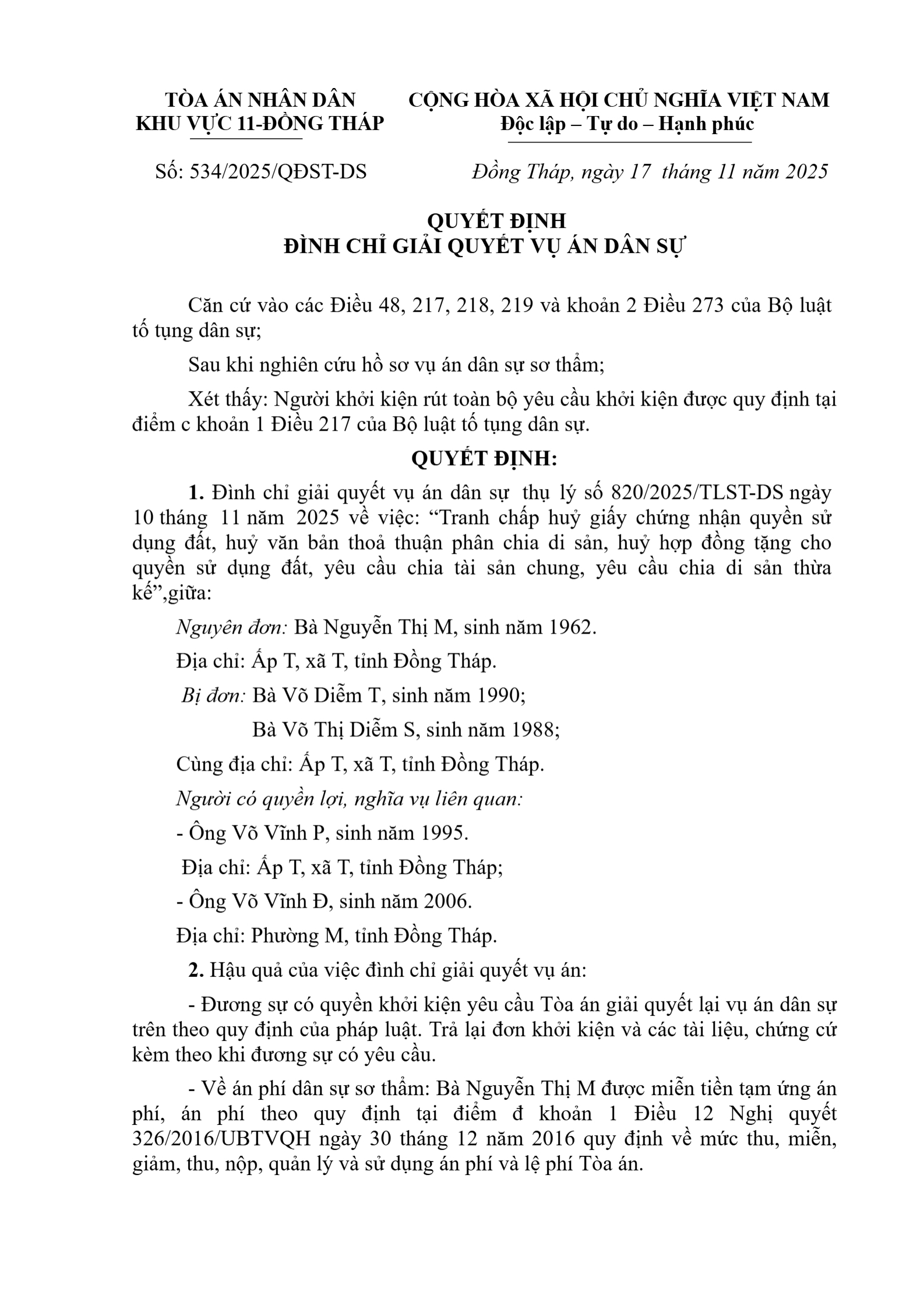 Quyết định số 534/2025/QĐST-DS ngày 17/11/2025 của Tòa án nhân dân khu vực 11 - Đồng Tháp, tỉnh Đồng Tháp về tranh chấp đất đai