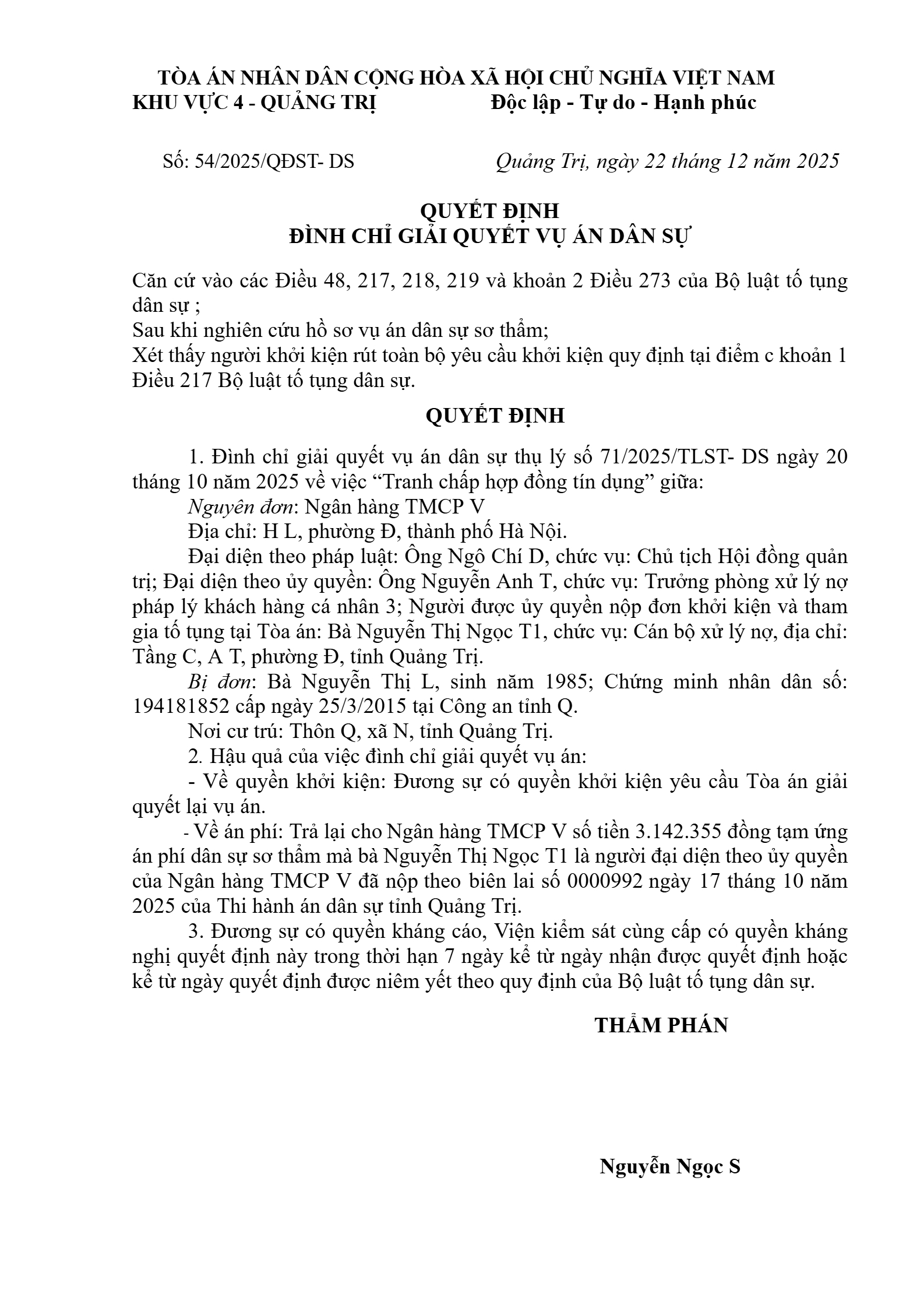 Quyết định số 54/2025/QĐST-DS ngày 22/12/2025 của Tòa án nhân dân khu vực 4 - Quảng Trị, tỉnh Quảng Trị về tranh chấp hợp đồng tín dụng