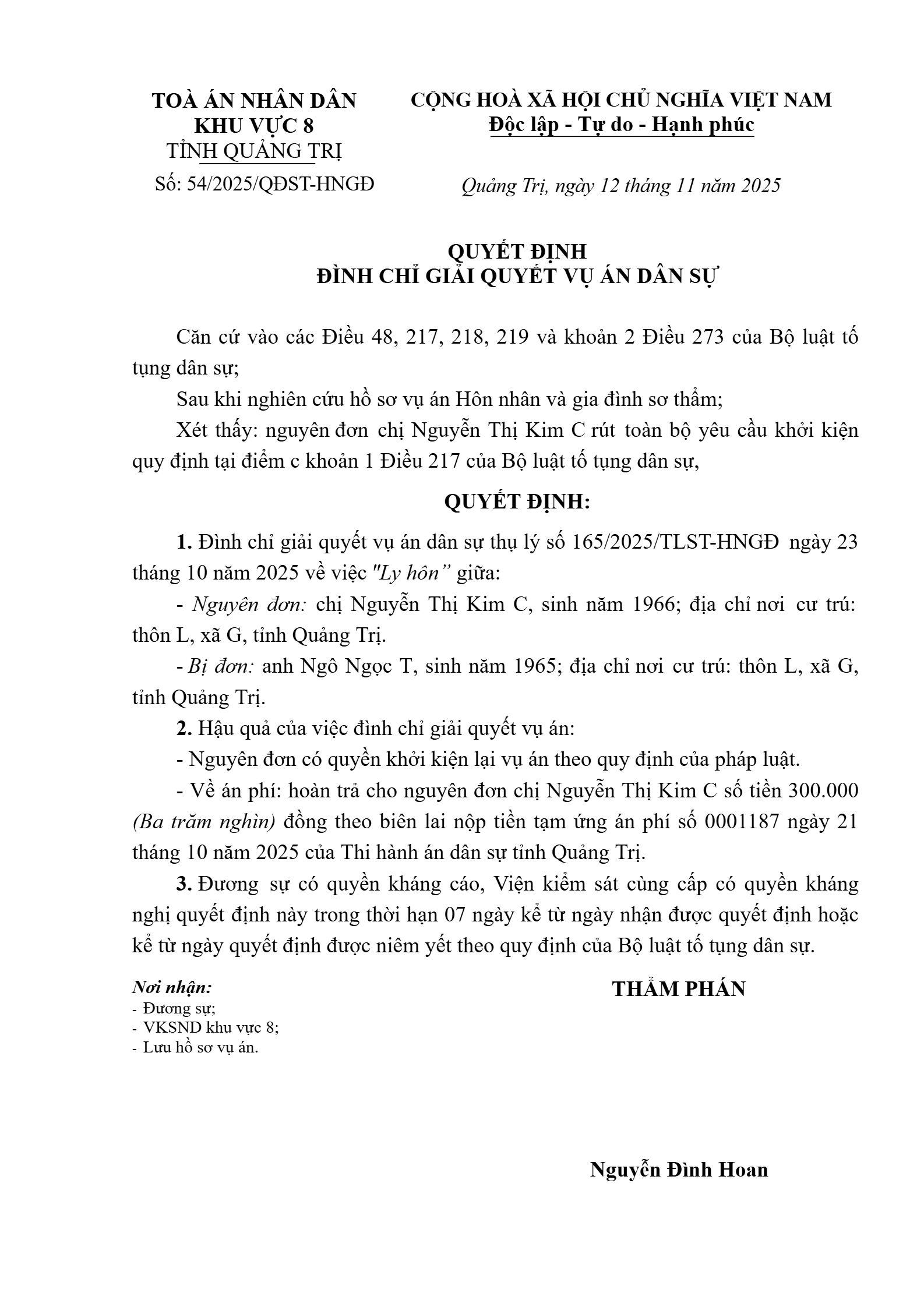 Quyết định số 54/2025/QĐST-HNGĐ ngày 12/11/2025 của Tòa án nhân dân khu vực 8 - Quảng Trị, tỉnh Quảng Trị về vụ án ly hôn về mâu thuẫn gia đình