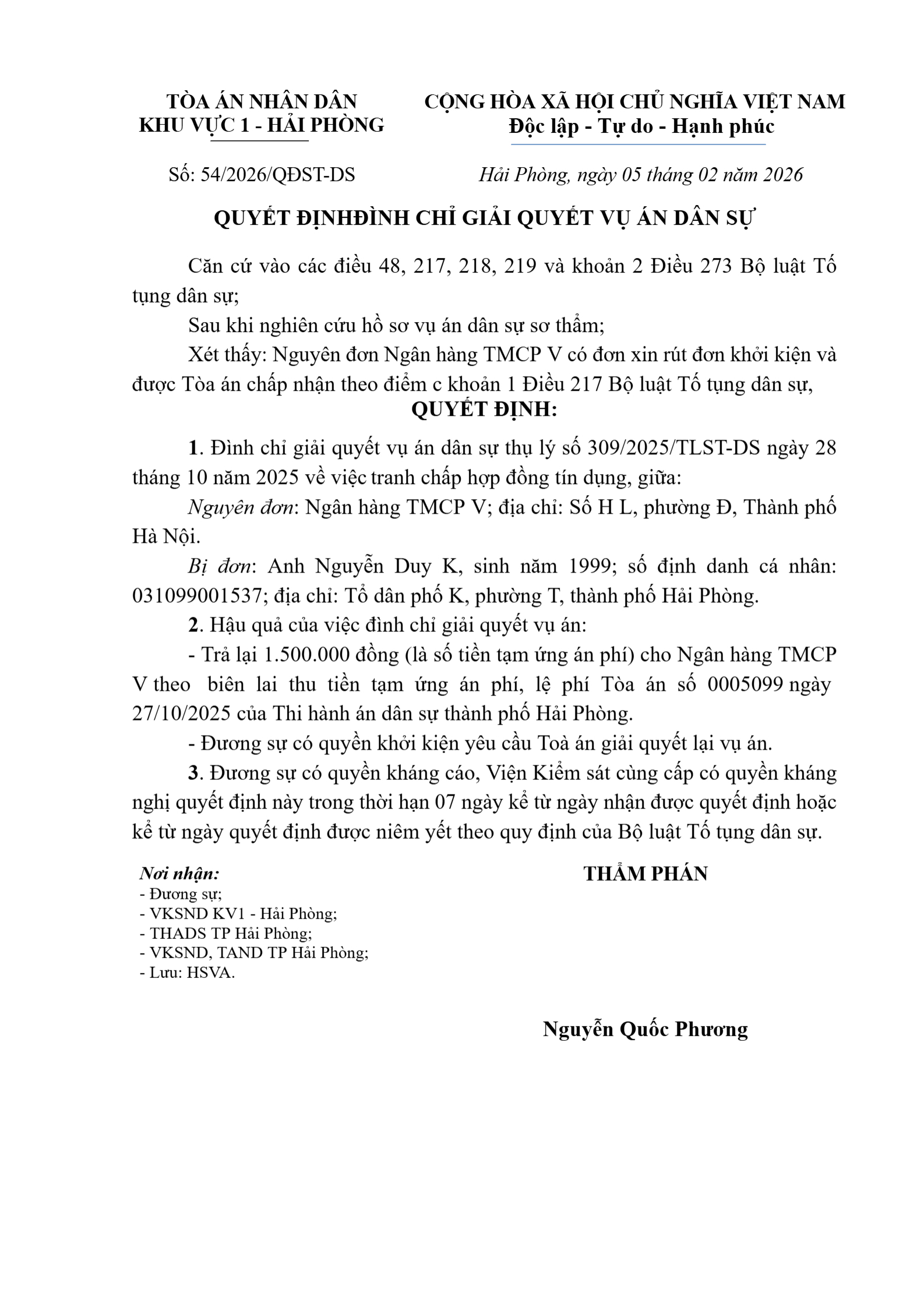 Quyết định số 54/2026/QĐST-DS ngày 05/02/2026 của Tòa án nhân dân khu vực 1 - Hải Phòng, TP. Hải Phòng về tranh chấp hợp đồng tín dụng