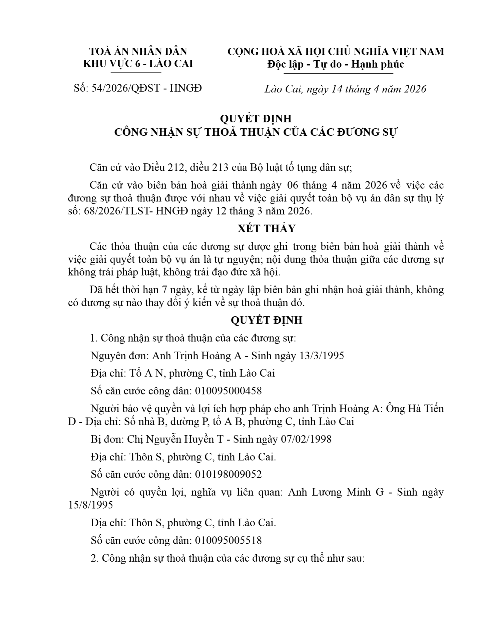 Quyết định số 54/2026/QĐST-HNGĐ ngày 14/04/2026 của Tòa án nhân dân khu vực 6 - Lào Cai, tỉnh Lào Cai về tranh chấp về xác định cha, mẹ cho con hoặc con cho cha mẹ