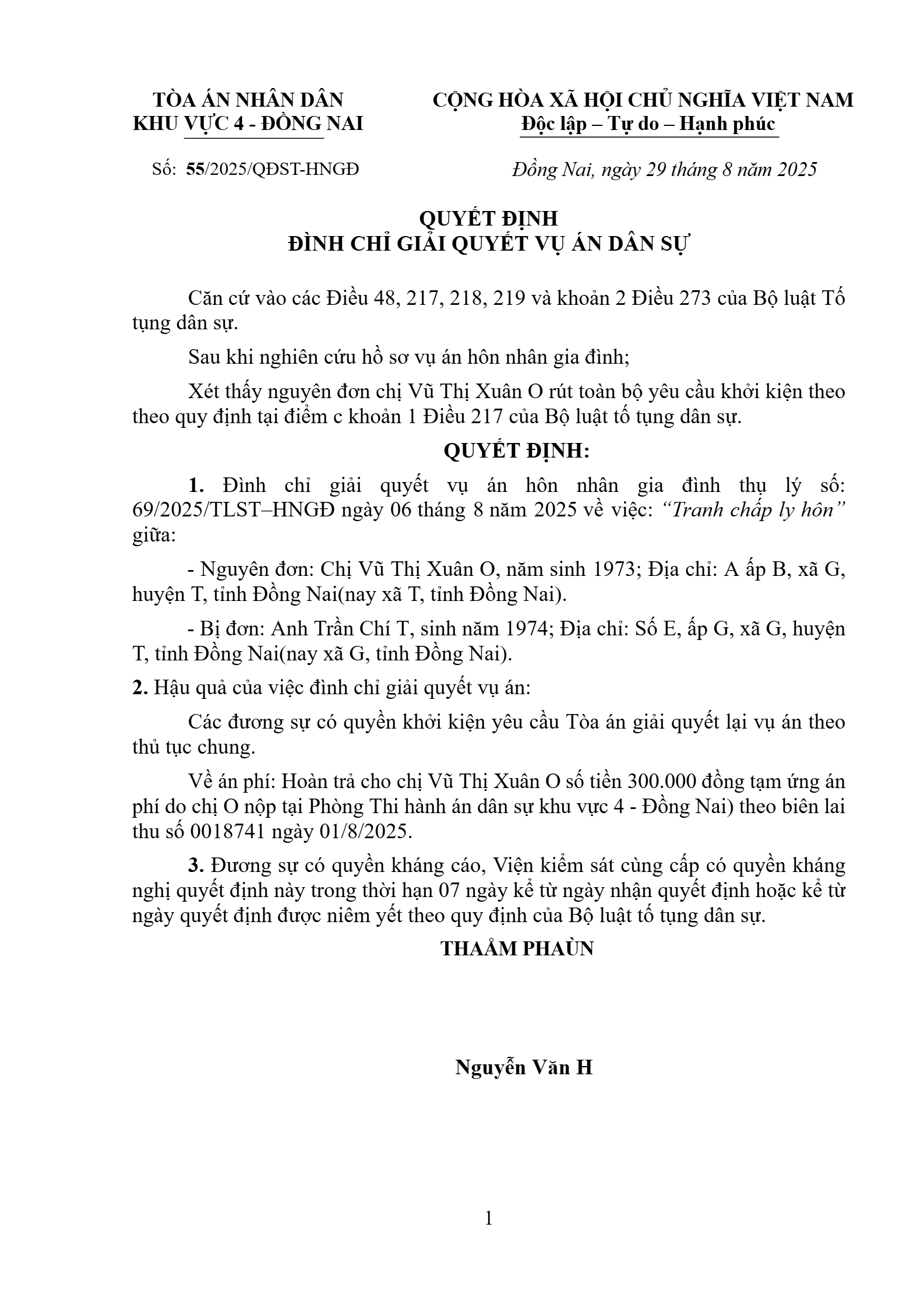Quyết định số 55/2025/QĐST-HNGĐ ngày 29/08/2025 của Tòa án nhân dân khu vực 4 - Đồng Nai, tỉnh Đồng Nai về vụ án ly hôn về mâu thuẫn gia đình