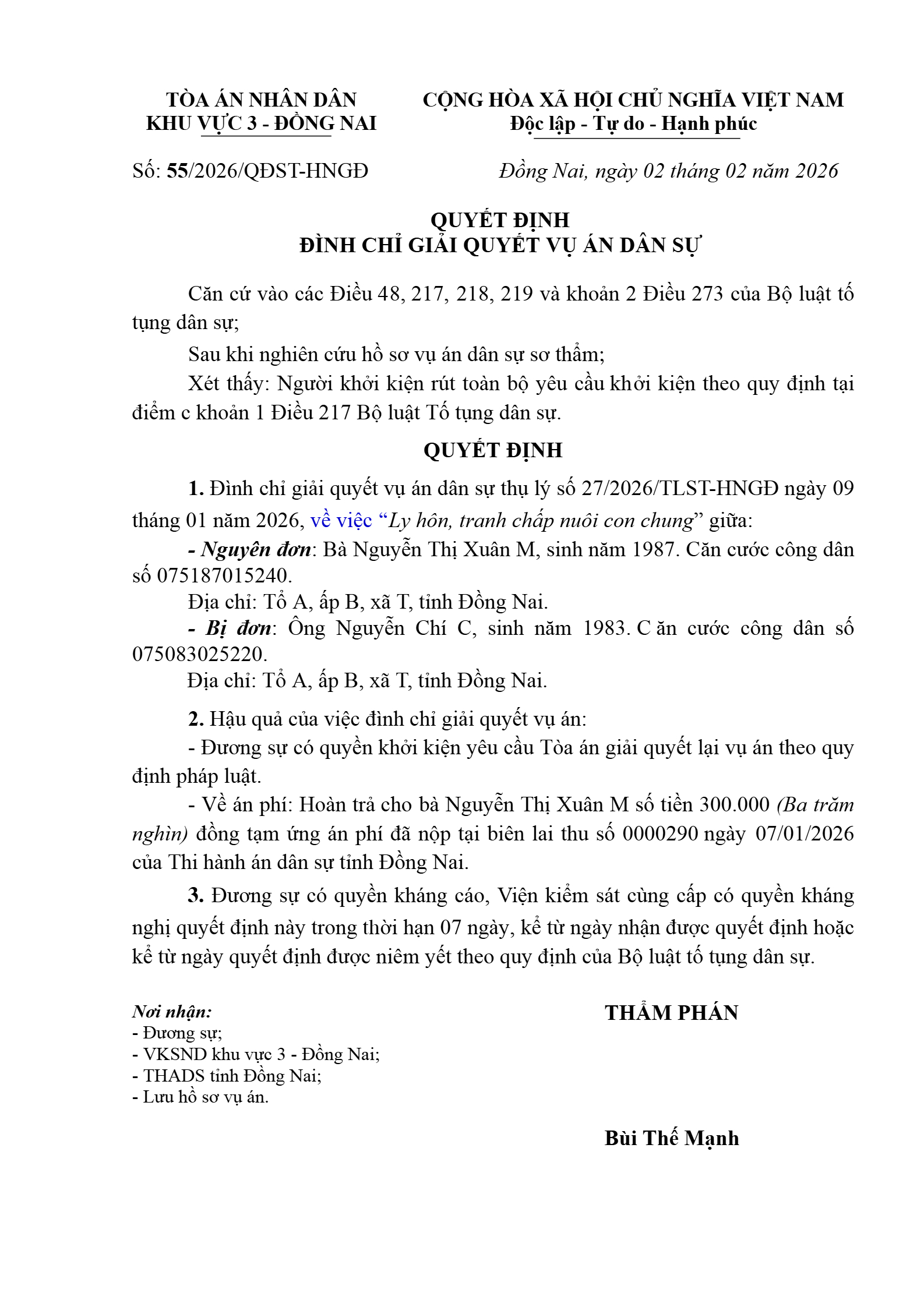 Quyết định số 55/2026/QĐST-HNGĐ ngày 02/02/2026 của Tòa án nhân dân khu vực 3 - Đồng Nai, tỉnh Đồng Nai về vụ án ly hôn về mâu thuẫn gia đình