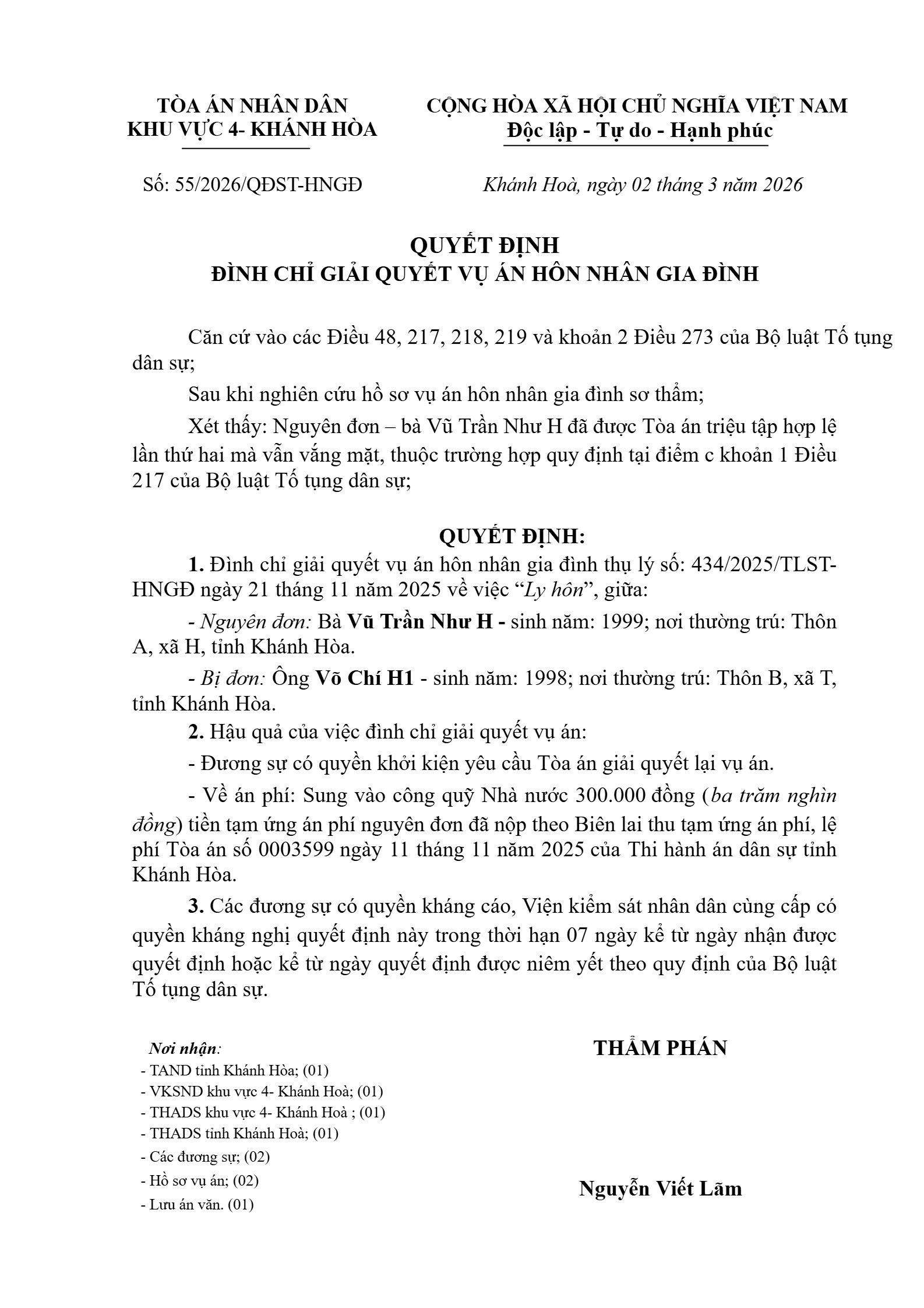 Quyết định số 55/2026/QĐST-HNGĐ ngày 02/03/2026 của Tòa án nhân dân khu vực 4 - Khánh Hòa, tỉnh Khánh Hòa về vụ án ly hôn về mâu thuẫn gia đình