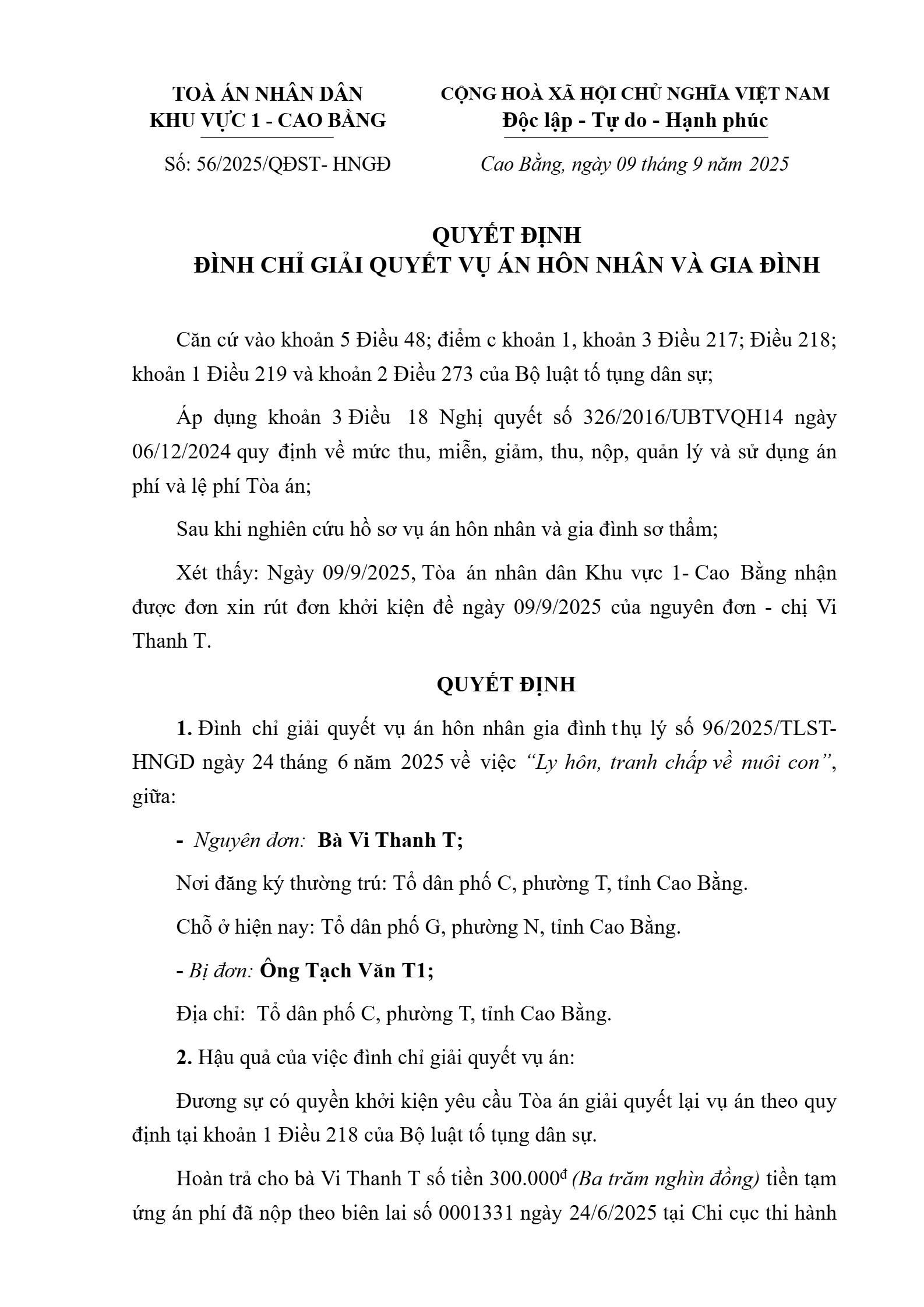 Quyết định số 56/2025/QĐST- ngày 09/09/2025 của Tòa án nhân dân khu vực 1 - Cao Bằng, tỉnh Cao Bằng về vụ án ly hôn về mâu thuẫn gia đình