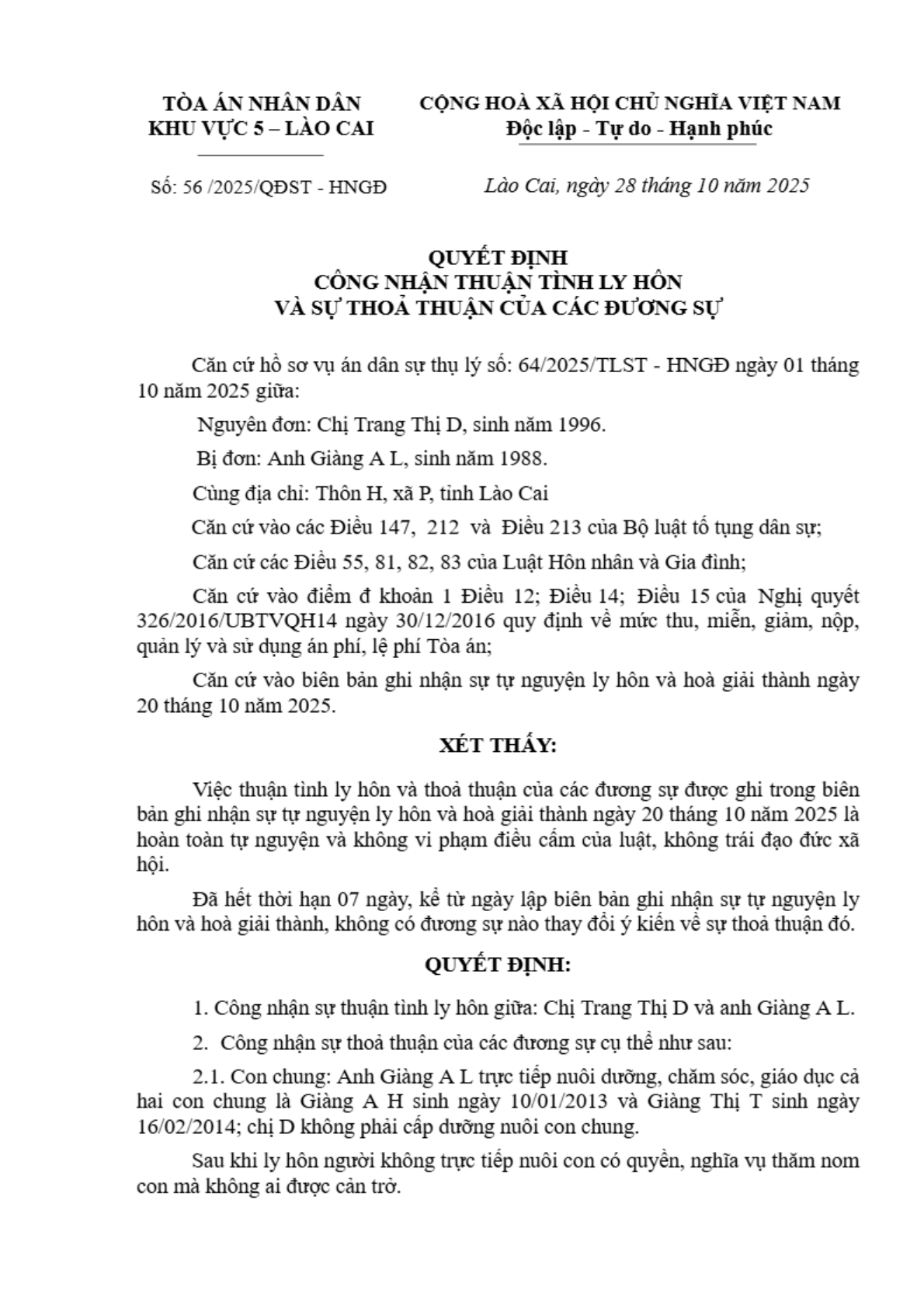 | Số hiệu: | 56/2025/QĐST-HNGĐ |