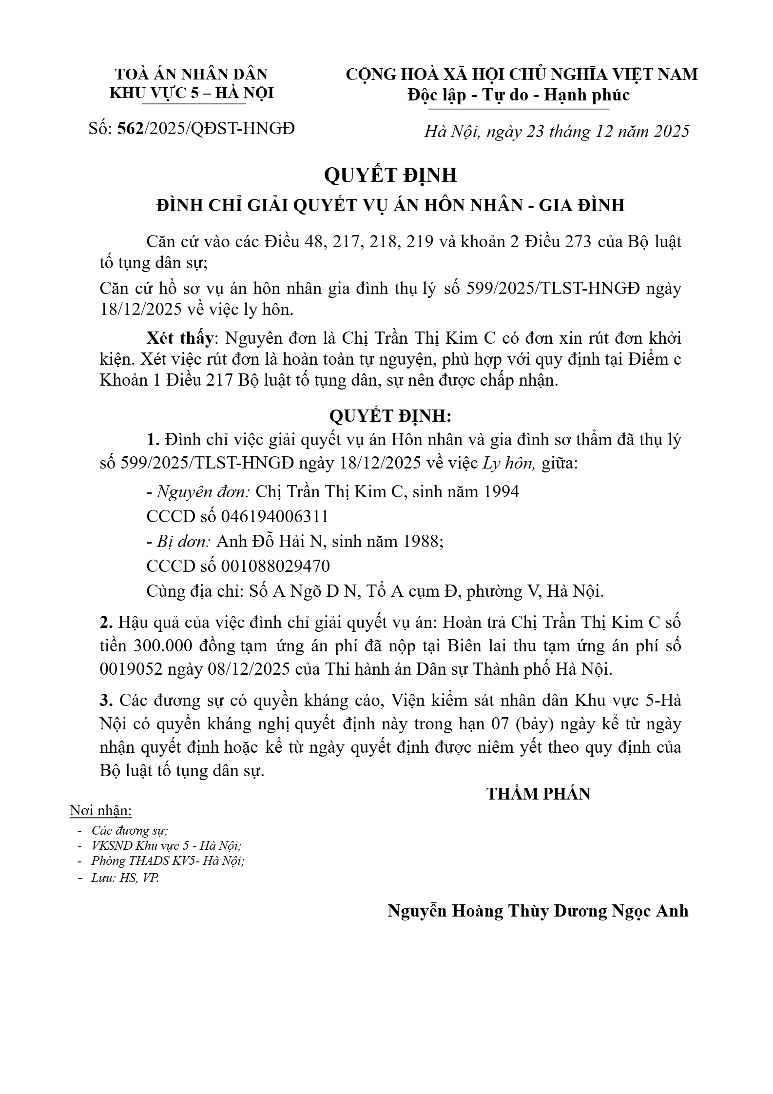 Quyết định số 562/2025/QĐST-HNGĐ ngày 23/12/2025 của Tòa án nhân dân khu vực 5 - Hà Nội, TP. Hà Nội về vụ án ly hôn về mâu thuẫn gia đình