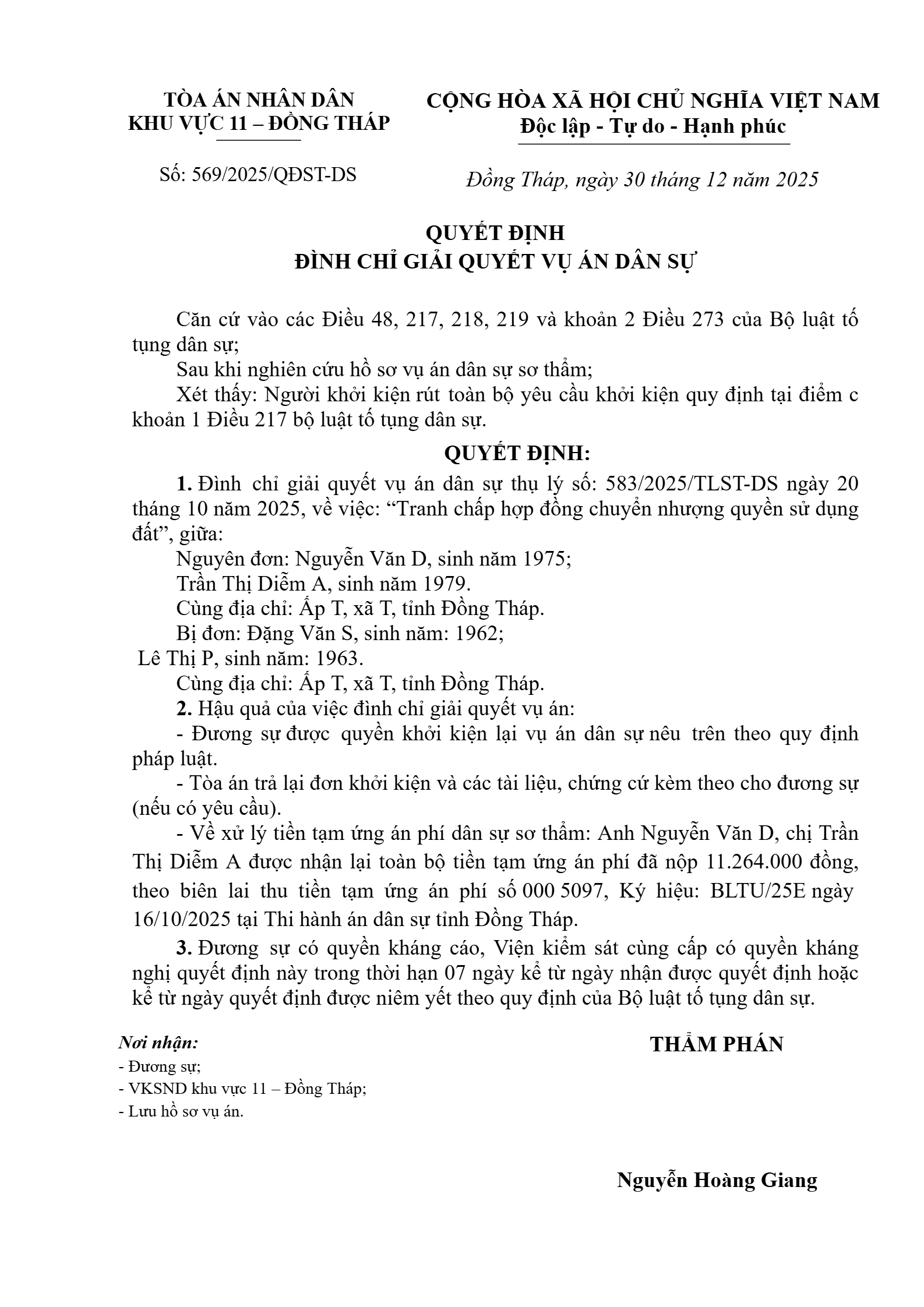 Quyết định số 569/2025/QĐST-DS ngày 30/12/2025 của Tòa án nhân dân khu vực 11 - Đồng Tháp, tỉnh Đồng Tháp về tranh chấp hợp đồng chuyển nhượng quyền sử dụng đất