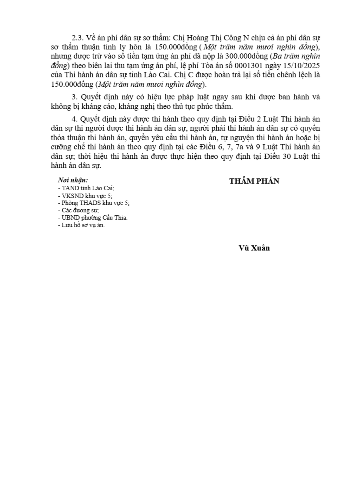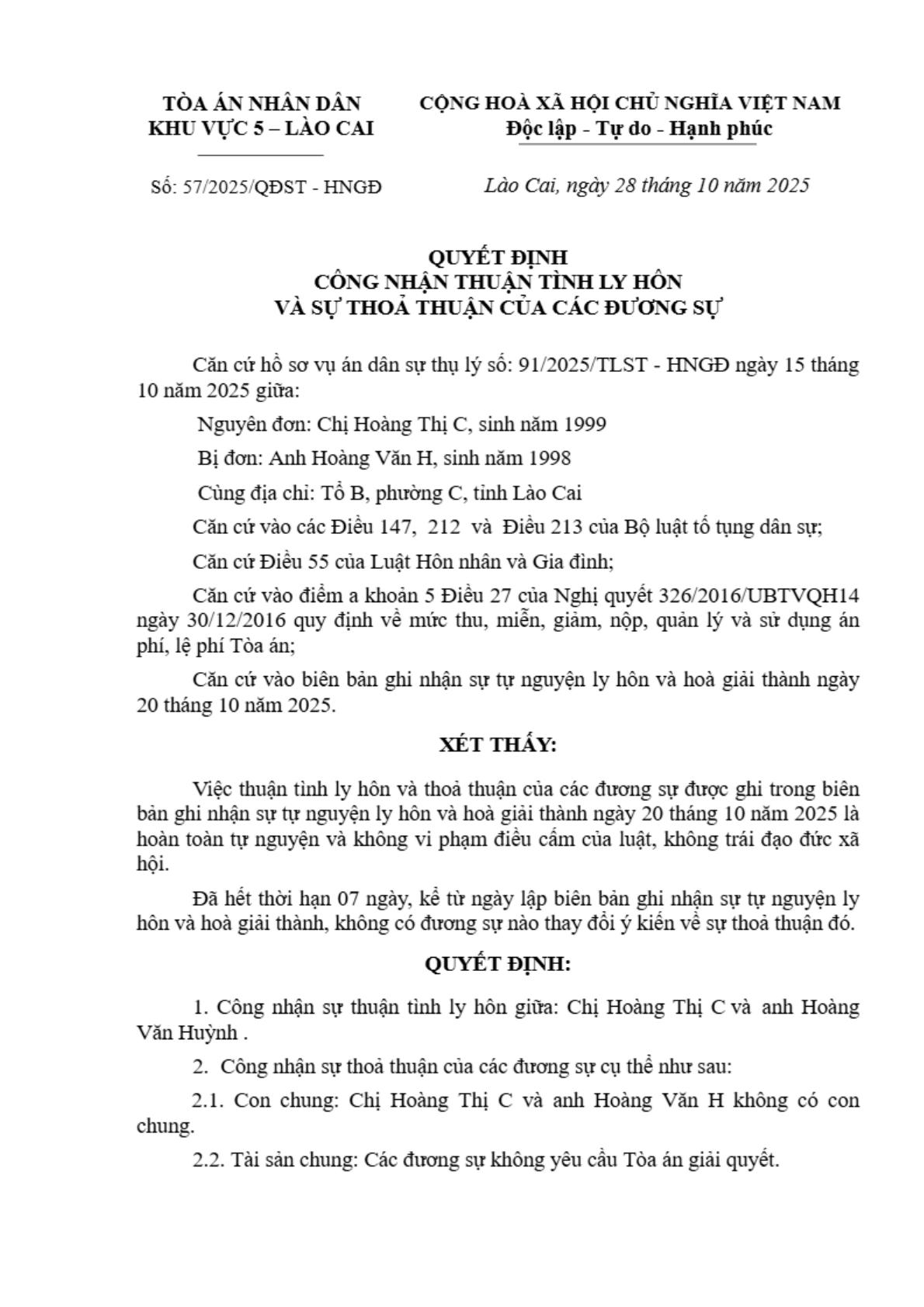 Quyết định số 57/2025/QĐST ngày 28/10/2025 của Tòa án nhân dân khu vực 5 - Lào Cai, tỉnh Lào Cai về vụ án ly hôn về mâu thuẫn gia đình