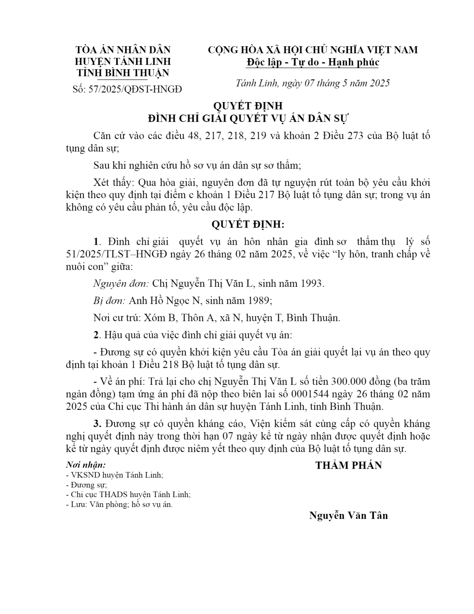 Quyết định số 57/2025/QĐST-HNGĐ ngày 07/05/2025 của TAND huyện Tánh Linh, tỉnh Bình Thuận về vụ án ly hôn về mâu thuẫn gia đình