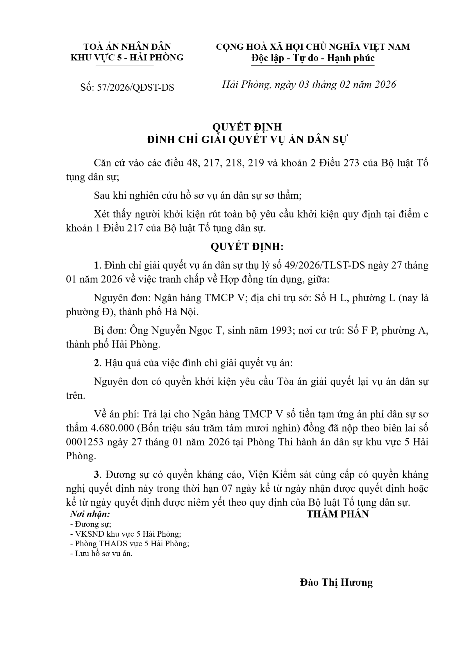 Quyết định số 57/2026/QĐST-DS ngày 03/02/2026 của Tòa án nhân dân khu vực 5 - Hải Phòng, TP. Hải Phòng về tranh chấp hợp đồng tín dụng
