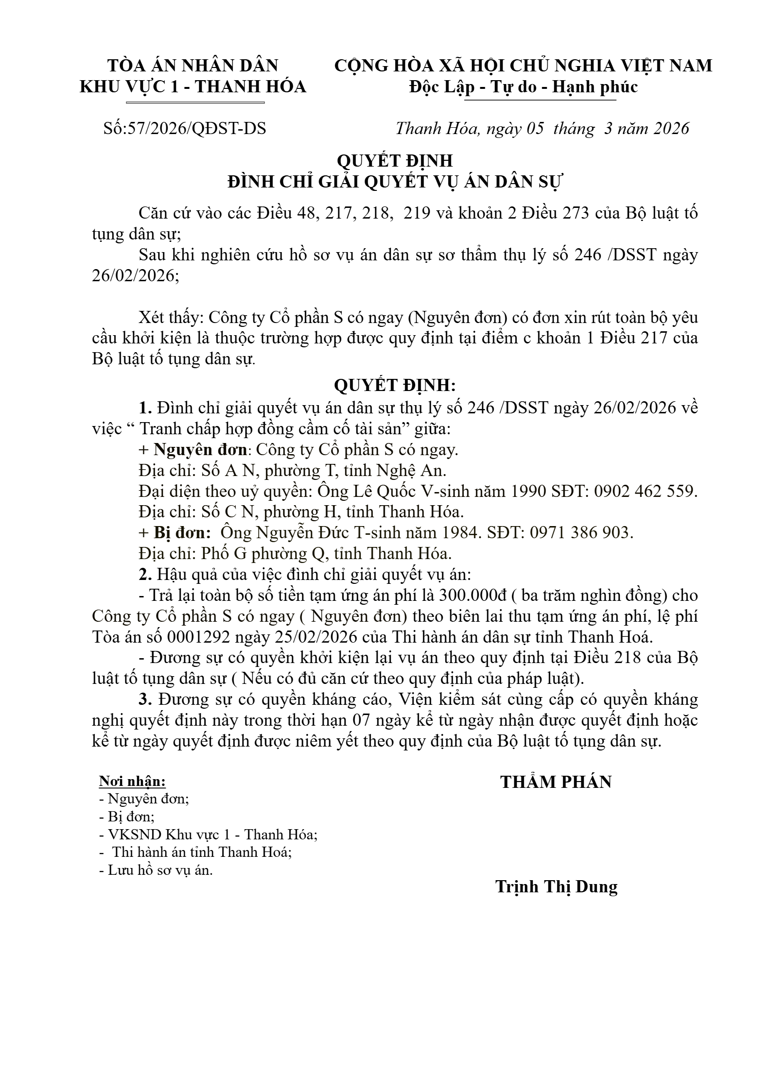 Quyết định số 57/2026/QĐST-DS ngày 05/03/2026 của Tòa án nhân dân khu vực 1 - Thanh Hóa, tỉnh Thanh Hóa về tranh chấp hợp đồng vay tài sản