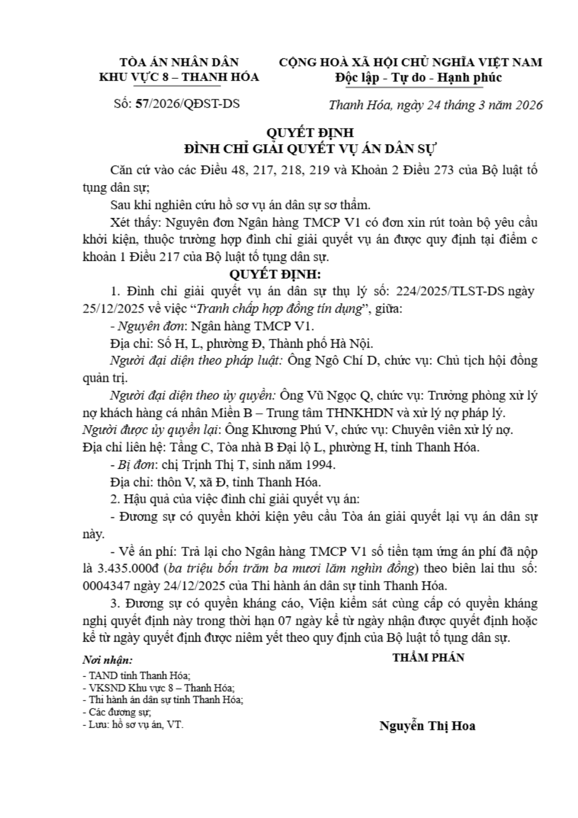 Quyết định số 57/2026/QĐST-DS ngày 24/03/2026 của Tòa án nhân dân khu vực 8 - Thanh Hóa, tỉnh Thanh Hóa về tranh chấp hợp đồng tín dụng