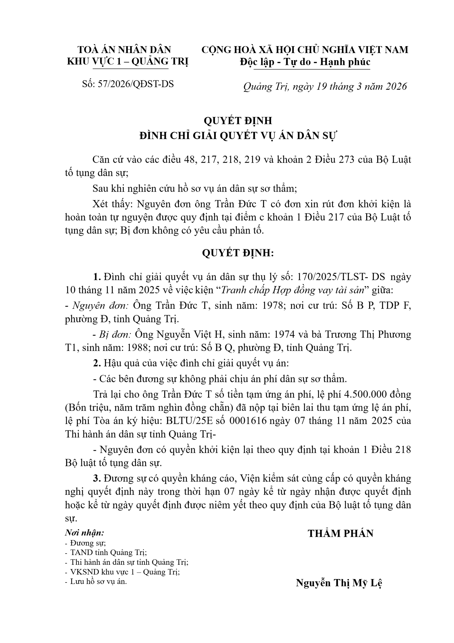Quyết định số 57/2026/QĐST-DS ngày 19/03/2026 của Tòa án nhân dân khu vực 1 - Quảng Trị, tỉnh Quảng Trị về tranh chấp hợp đồng vay tài sản