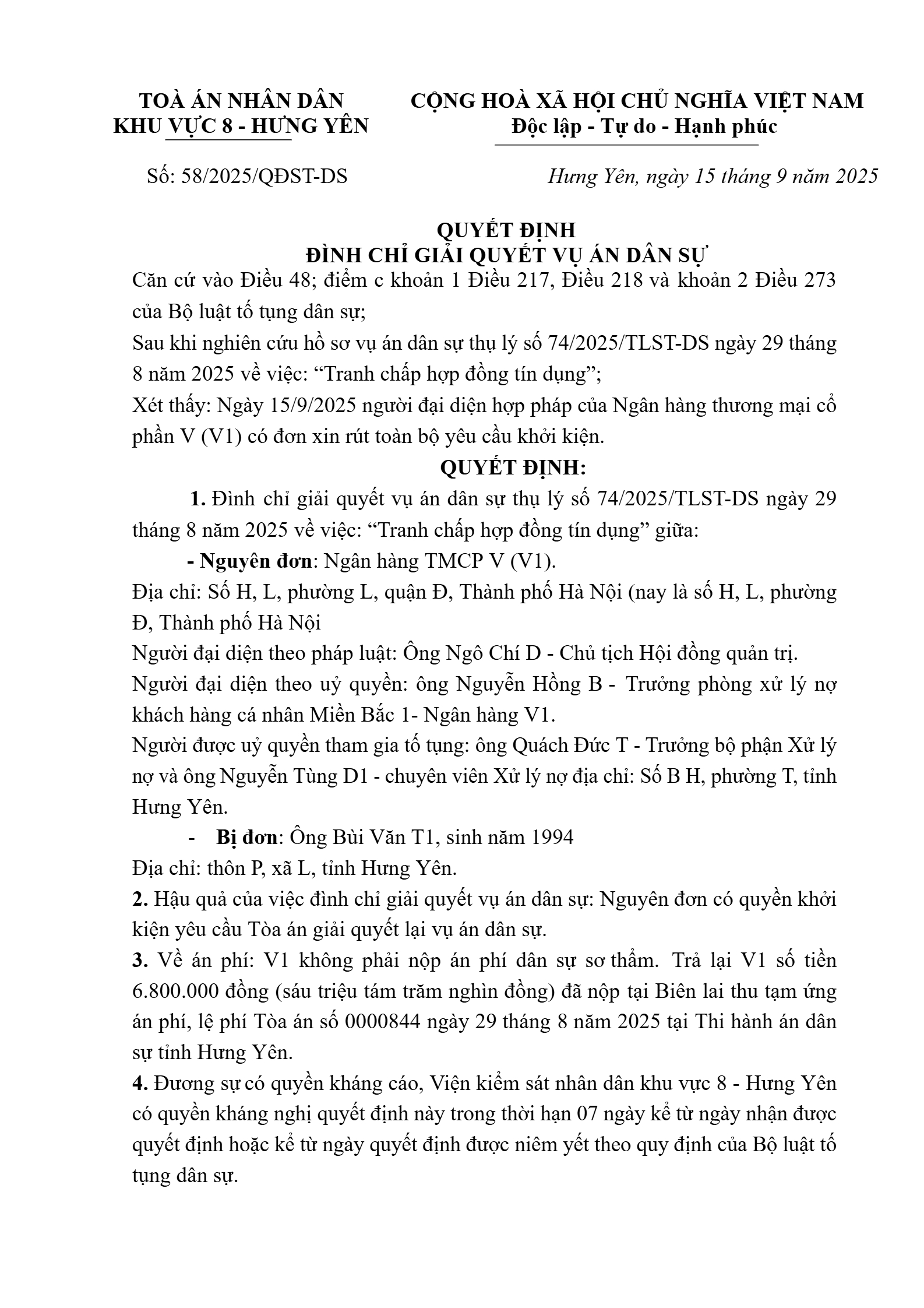 Quyết định số 58/2025/QĐST-DS ngày 15/09/2025 của Tòa án nhân dân khu vực 8 - Hưng Yên, tỉnh Hưng Yên về tranh chấp hợp đồng tín dụng