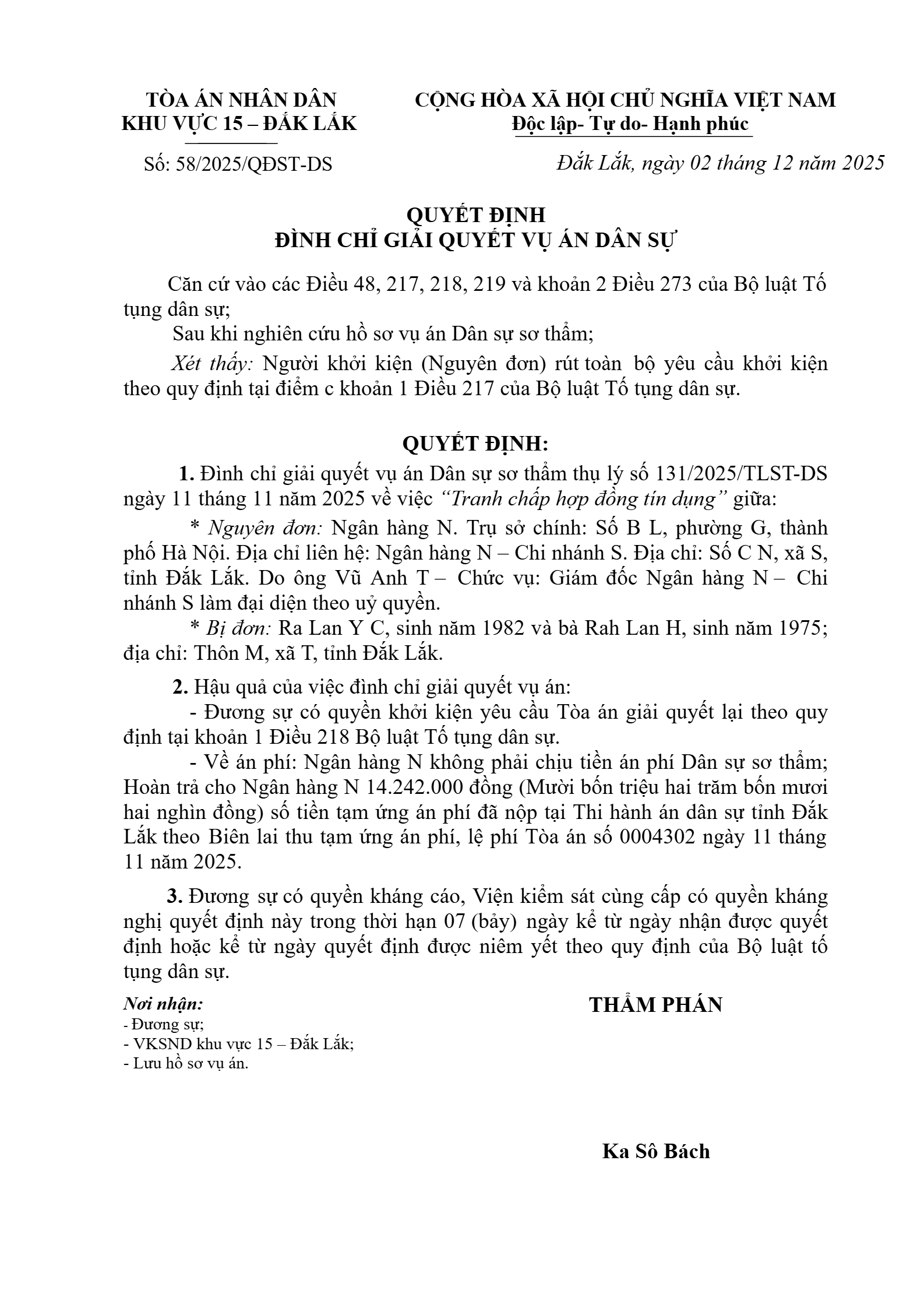 Quyết định số 58/2025/QĐST-DS ngày 02/12/2025 của Tòa án nhân dân khu vực 15 - Đắk Lắk, tỉnh Đắk Lắk về tranh chấp hợp đồng tín dụng