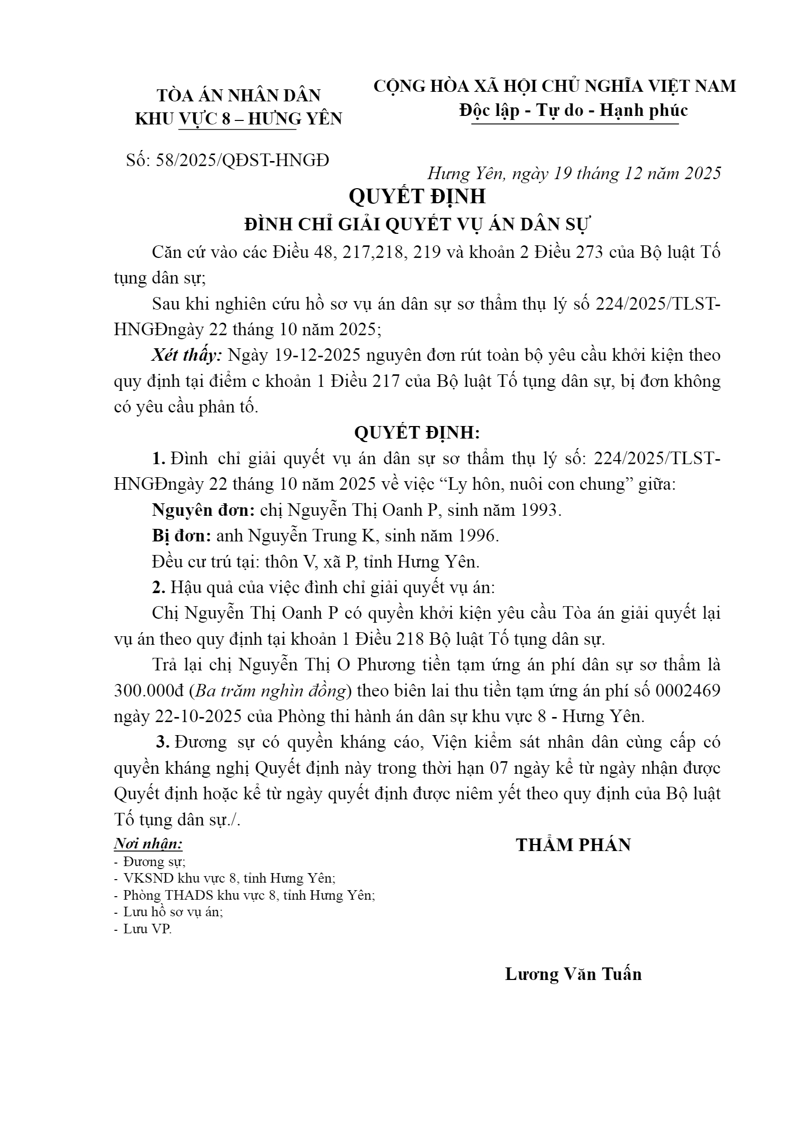 Quyết định số 58/2025/QĐST-HNGĐ ngày 19/12/2025 của Tòa án nhân dân khu vực 8 - Hưng Yên, tỉnh Hưng Yên về vụ án ly hôn về mâu thuẫn gia đình