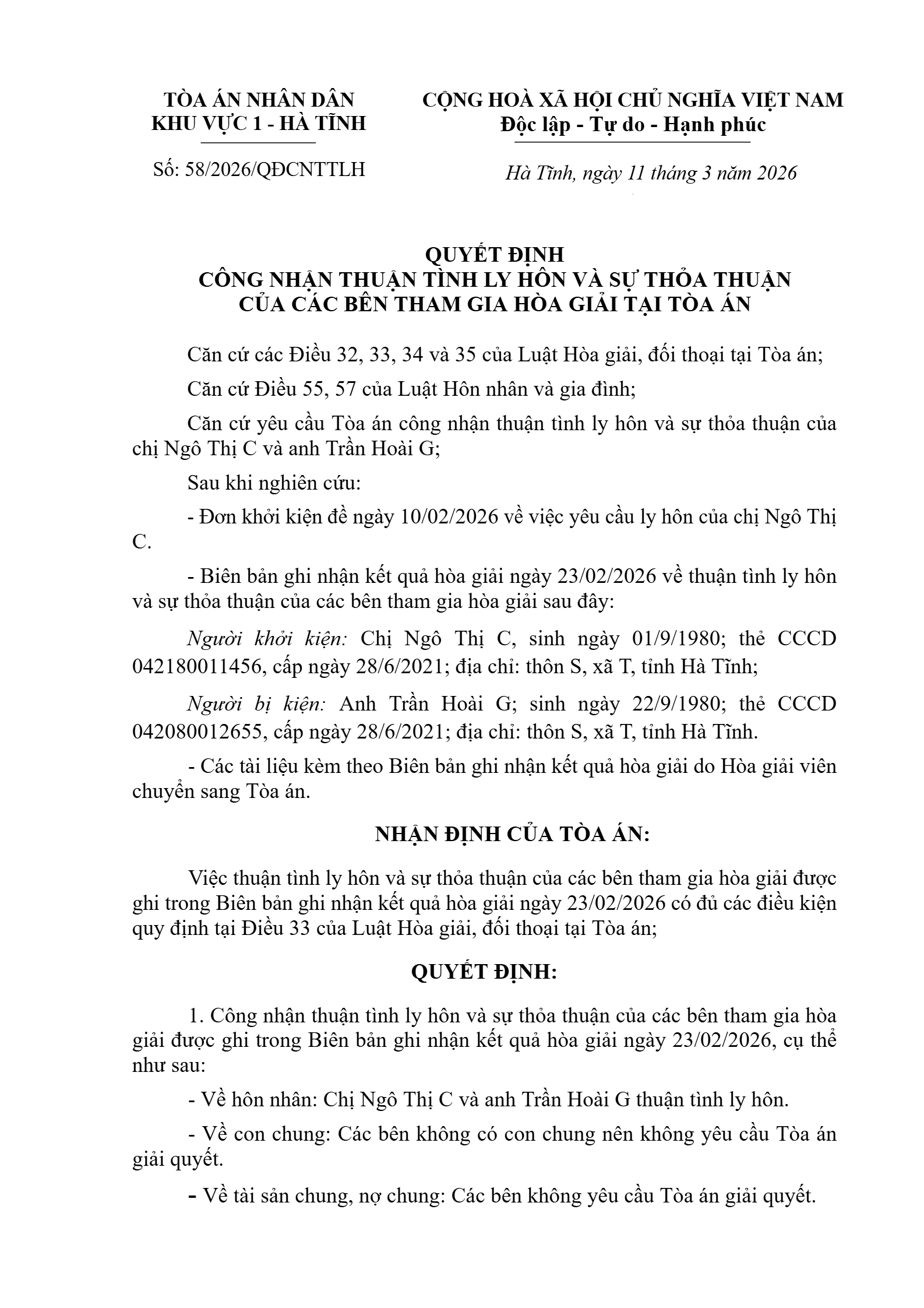 Quyết định số 58/2026/QĐCNTTLH ngày 12/03/2026 của Tòa án nhân dân khu vực 1 - Hà Tĩnh, tỉnh Hà Tĩnh về vụ án ly hôn về mâu thuẫn gia đình