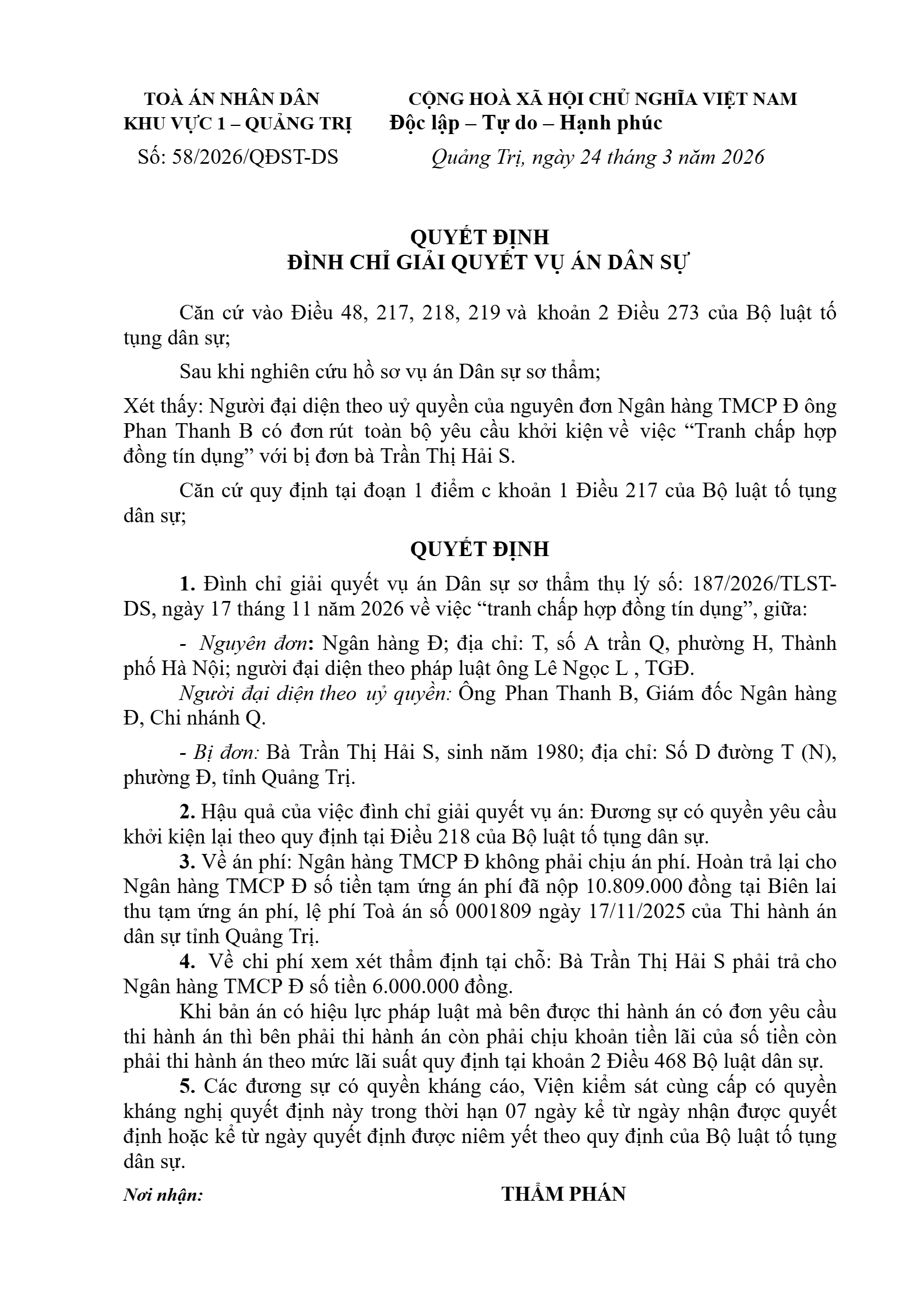 Quyết định số 58/2026/QĐST-DS ngày 24/03/2026 của Tòa án nhân dân khu vực 1 - Quảng Trị, tỉnh Quảng Trị về tranh chấp hợp đồng tín dụng