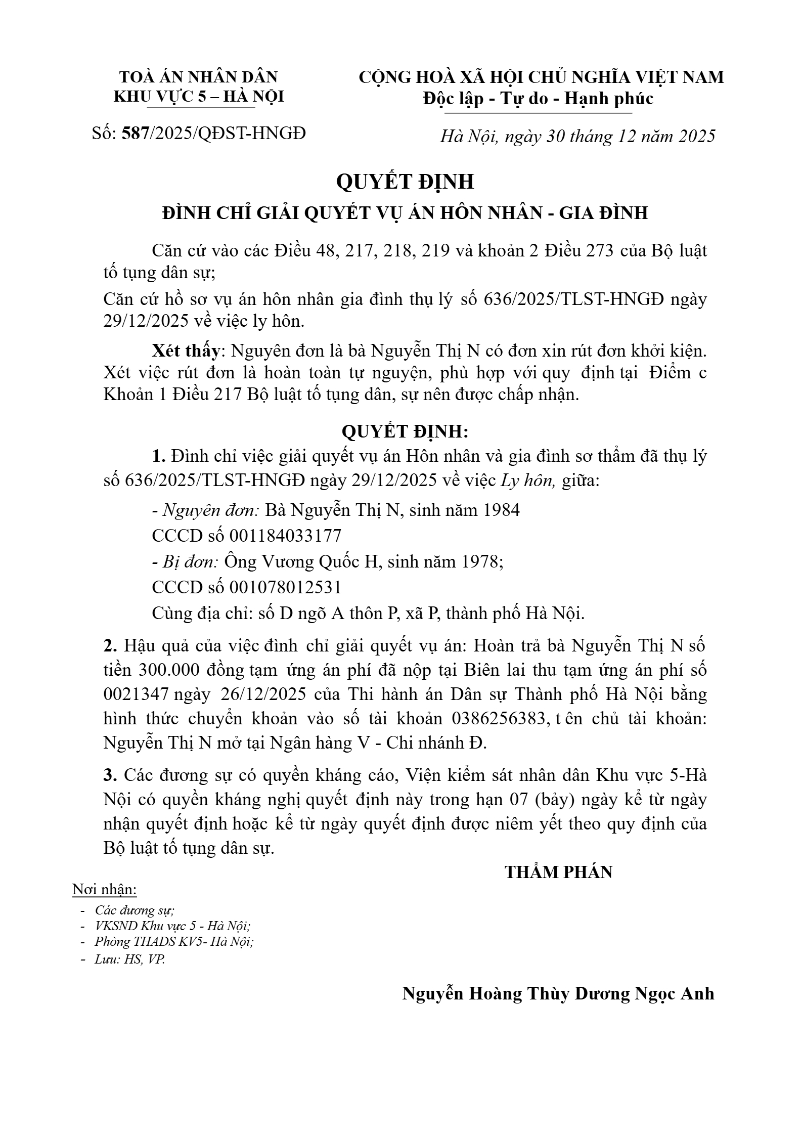 Quyết định số 587/2025/QĐST-HNGĐ