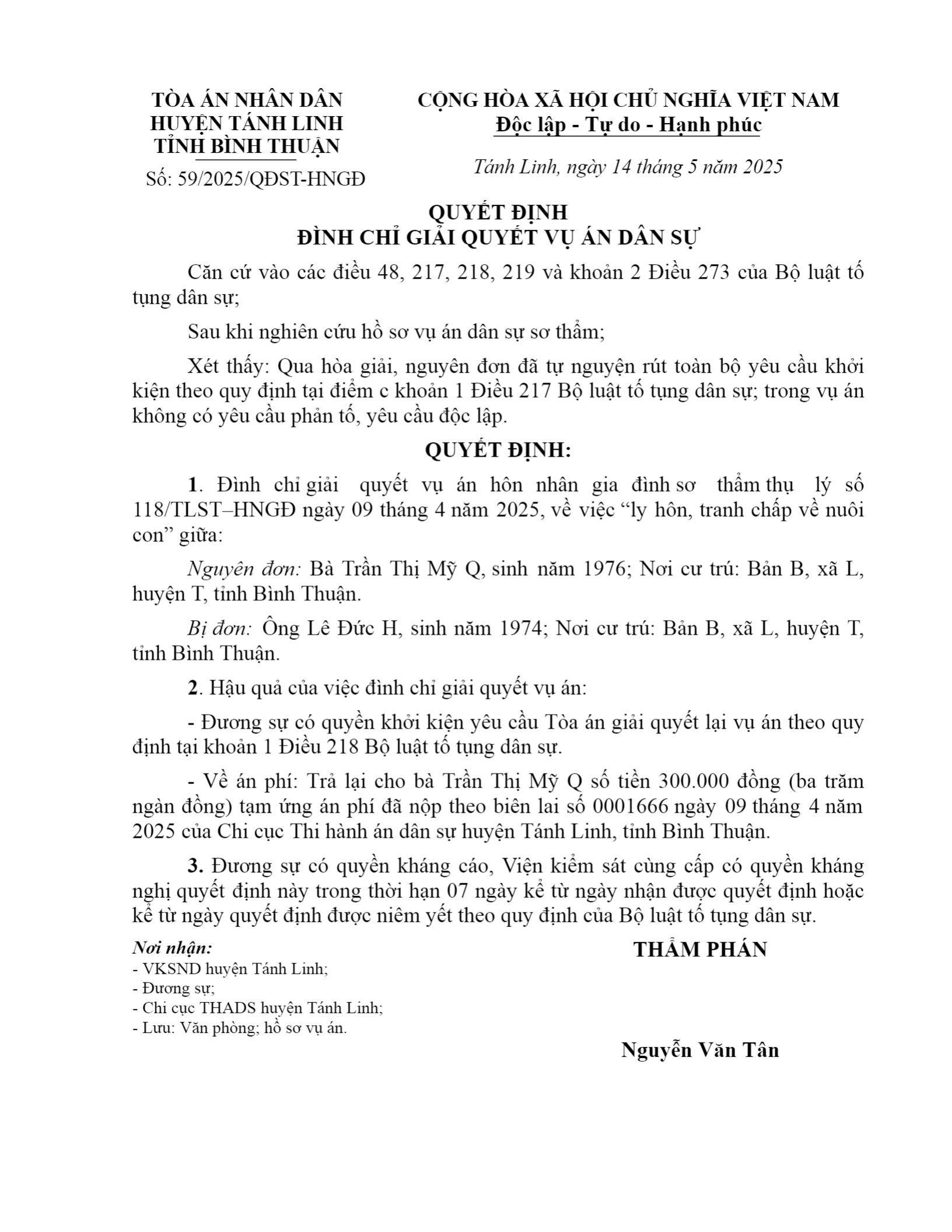 Quyết định số 59/2025/QĐST-HNGĐ ngày 14/05/2025 của TAND huyện Tánh Linh, tỉnh Bình Thuận về vụ án ly hôn về mâu thuẫn gia đình