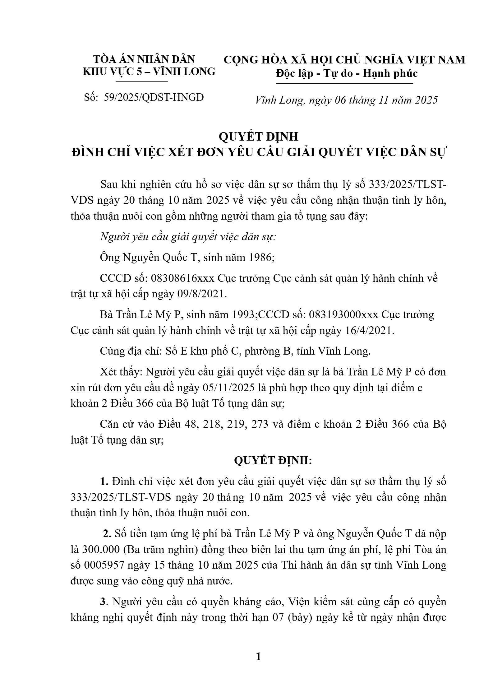 Quyết định số 59/2025/QĐST-HNGĐ ngày 06/11/2025 của Tòa án nhân dân khu vực 5 - Vĩnh Long, tỉnh Vĩnh Long về yêu cầu công nhận thuận tình ly hôn