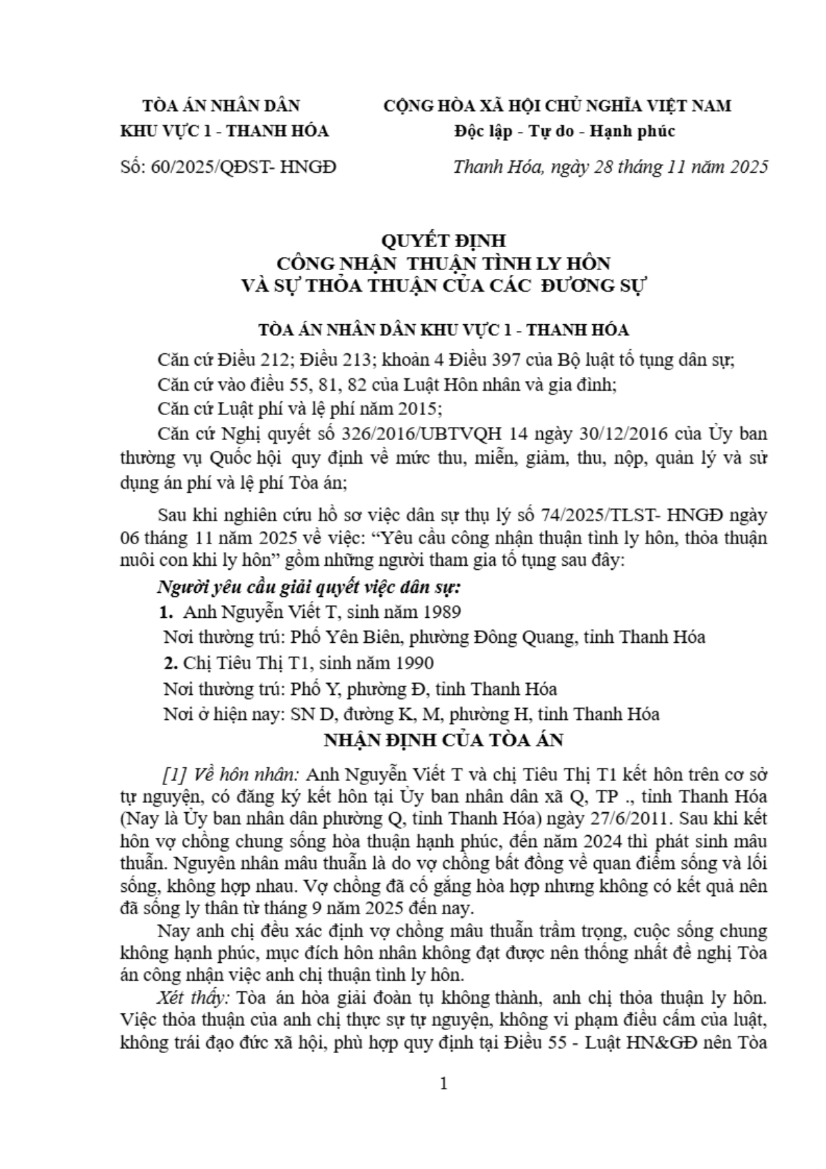 Quyết định số 60/2025/QĐST-HNGĐ ngày 28/11/2025 của Tòa án nhân dân khu vực 1 - Thanh Hóa, tỉnh Thanh Hóa về yêu cầu công nhận thuận tình ly hôn