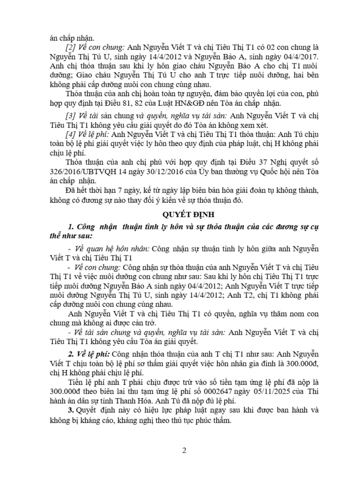 | Thông tin về vụ/việc: | Nguyễn Viết T - Tiêu Thị T (Thuận tình ly hôn) |