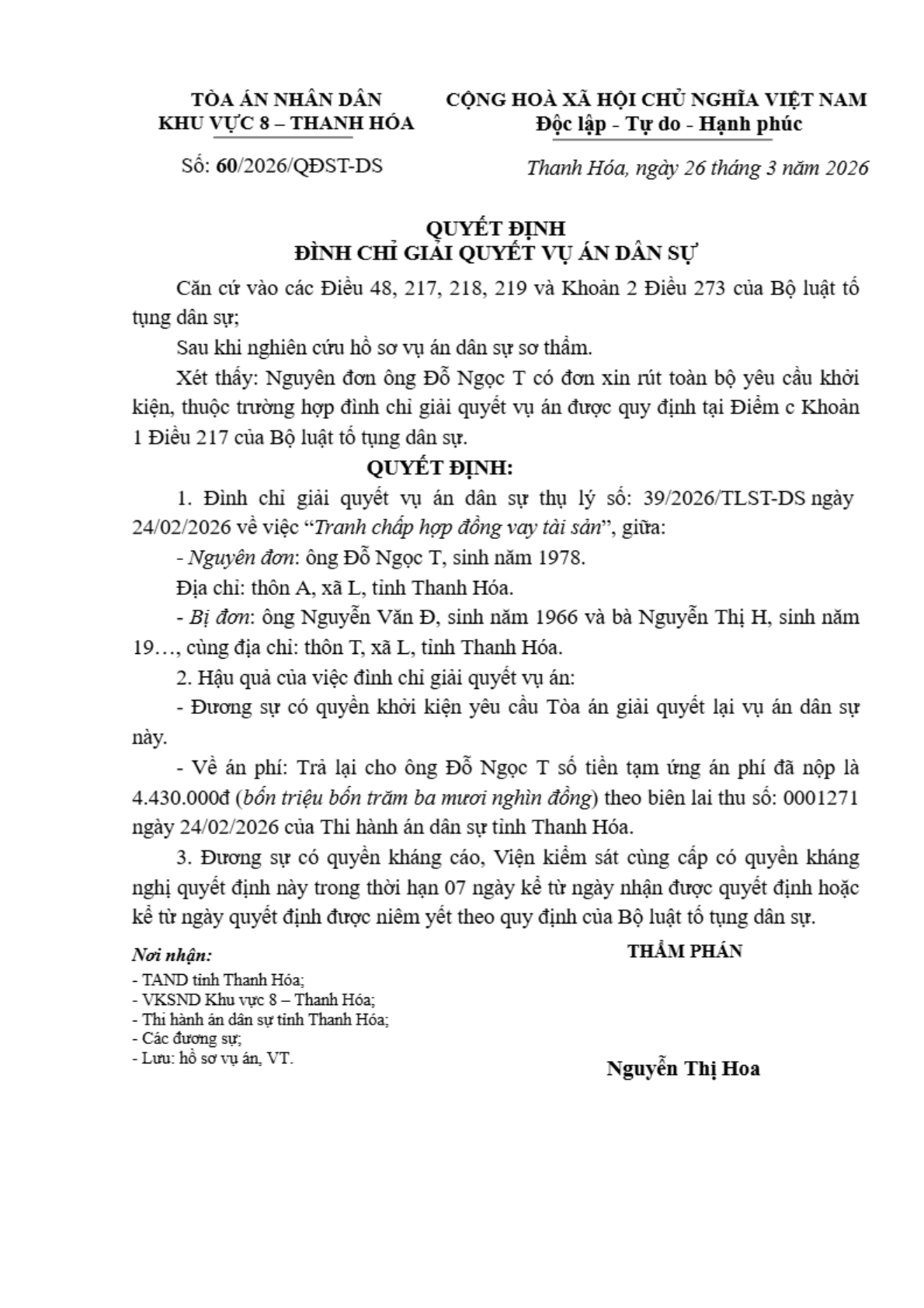 Quyết định số 60/2026/QĐST-DS ngày 26/03/2026 của Tòa án nhân dân khu vực 8 - Thanh Hóa, tỉnh Thanh Hóa về tranh chấp hợp đồng vay tài sản