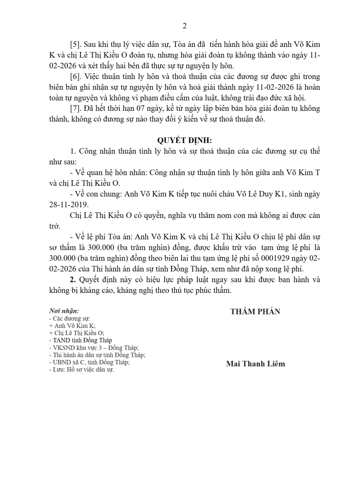 | Thông tin về vụ/việc: | K- O thuận tình ly hôn |