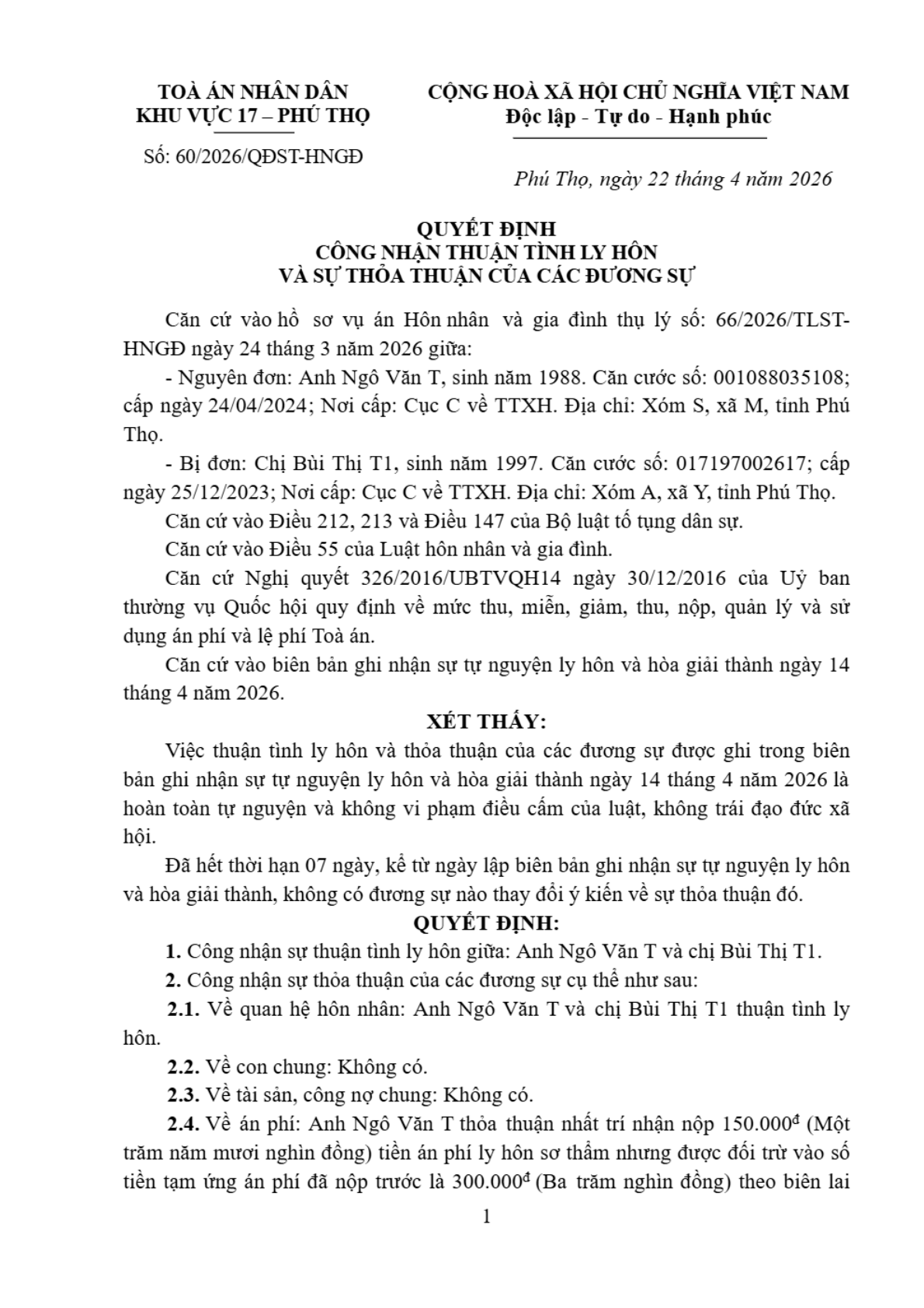 Quyết định số 60/2026/QĐST-HNGĐ ngày 22/04/2026 của Tòa án nhân dân khu vực 17 - Phú Thọ, tỉnh Phú Thọ về vụ án ly hôn về mâu thuẫn gia đình