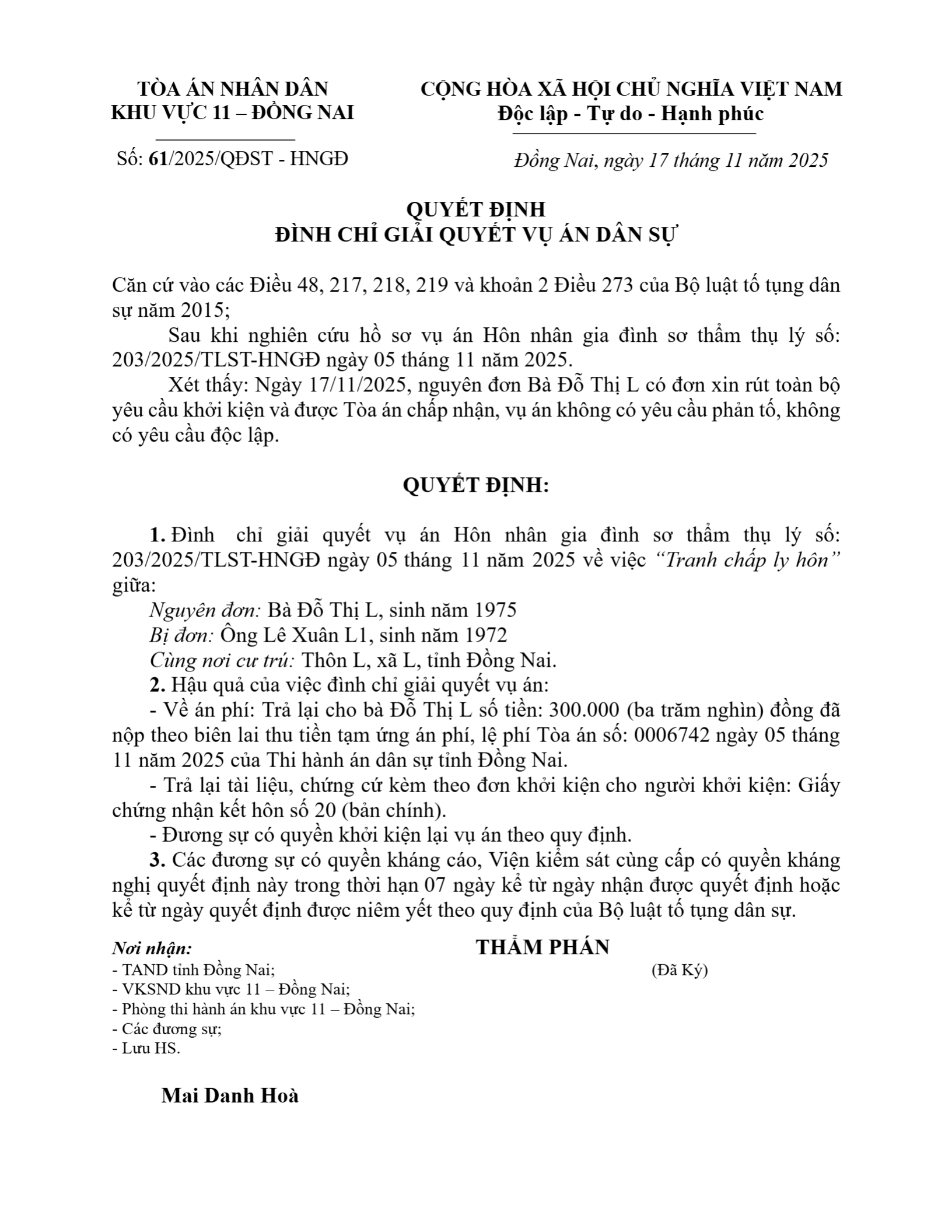 Quyết định số 61/2025/QĐĐC-HNGĐ ngày 16/11/2025 của Tòa án nhân dân khu vực 11 - Đồng Nai, tỉnh Đồng Nai về vụ án ly hôn về mâu thuẫn gia đình